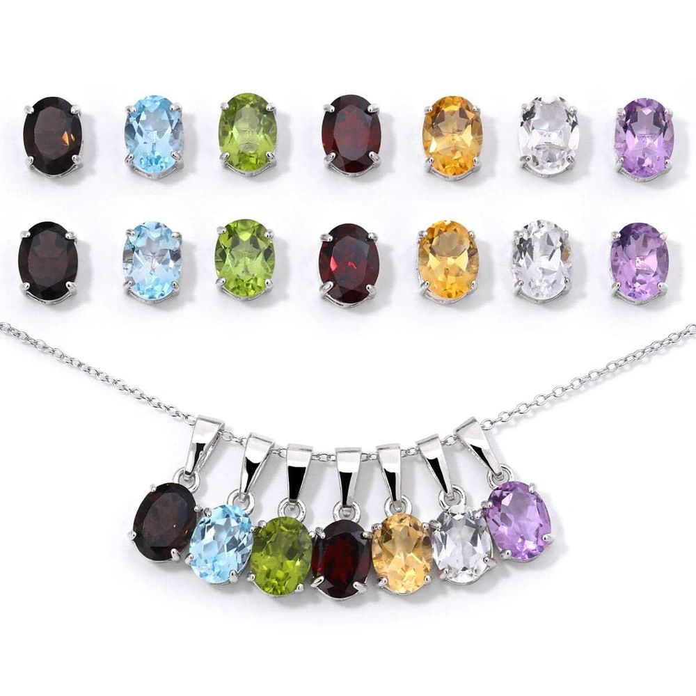 Em pedras na sequência da esquerda para direita: Topázio Fumê, Topázio Azul, Peridoto, Granada, Citrino, Topázio Branco e Ametista