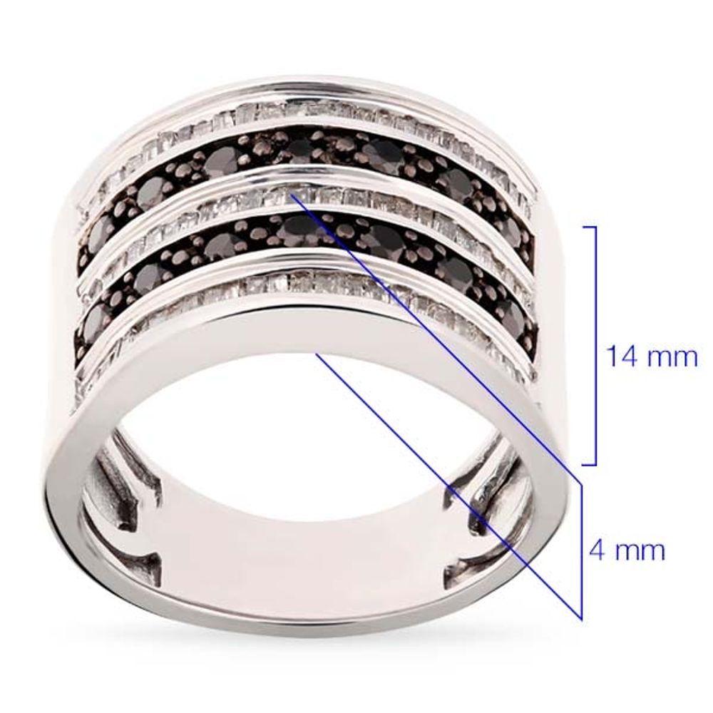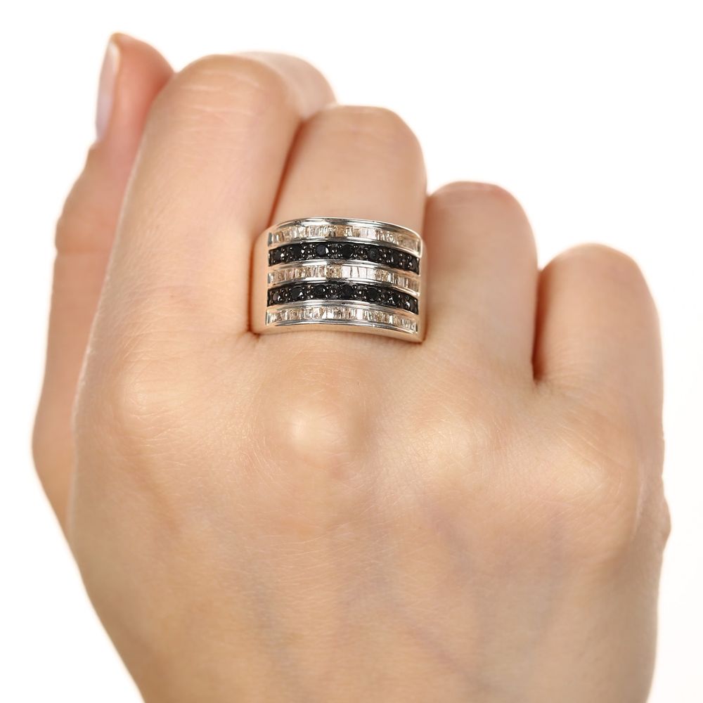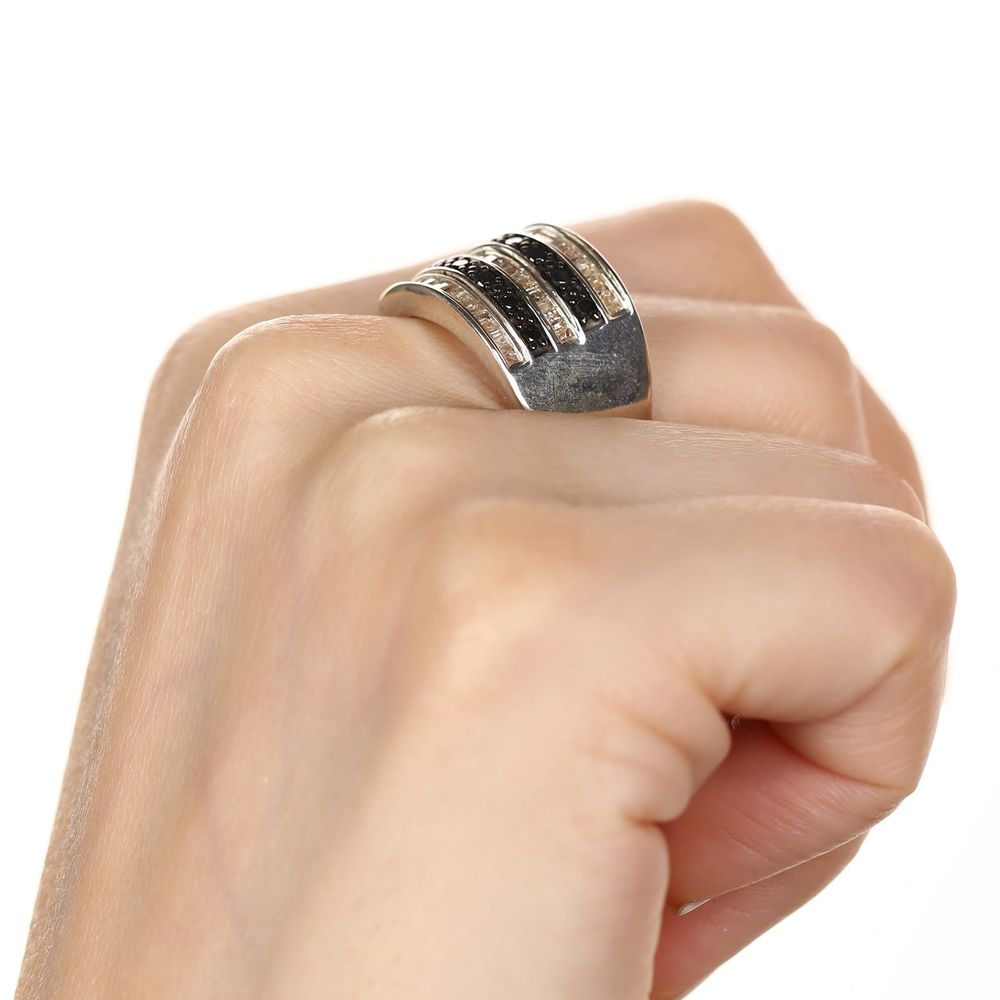 Jóia composta por 5 fileiras de diamantes, entre eles negros e brancos, formando um maravilhoso anél vistoso e muito valioso.