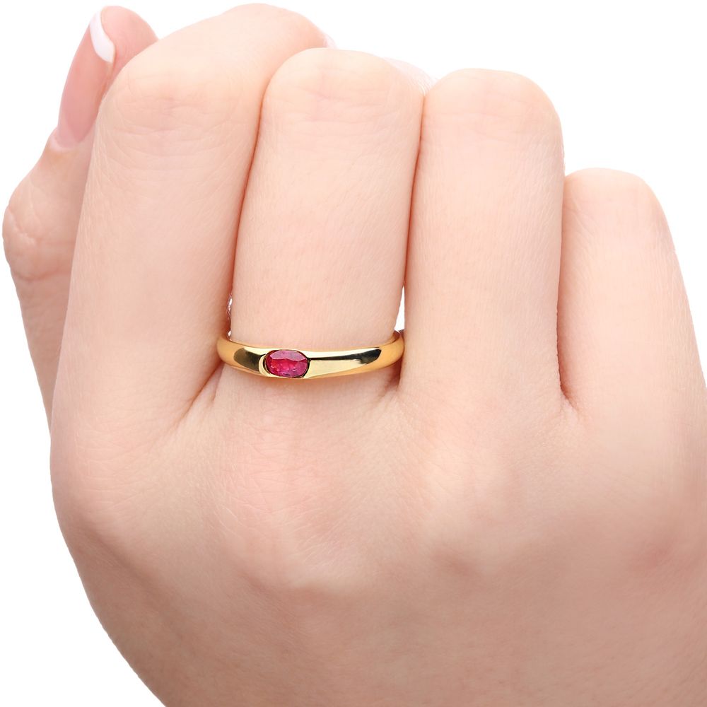 Este anel em ouro 18K, com rubi oval de aproximadamente 30 pontos,