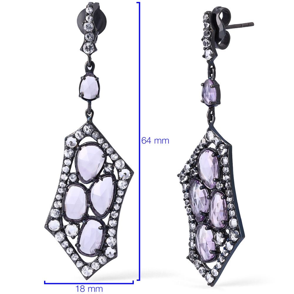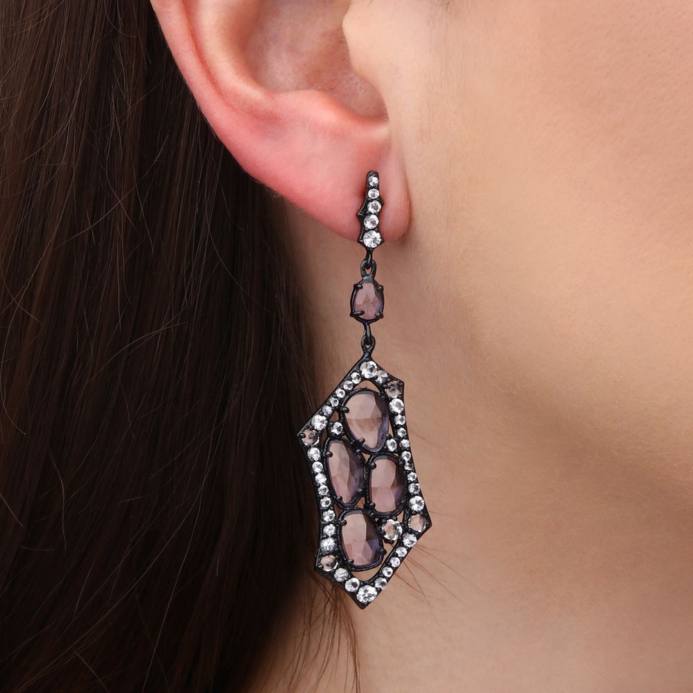 A beleza das ametistas é realçada pelo brilho suave dos topázios brancos, que adicionam luz e contraste à composição, criando um visual equilibrado e refinado.