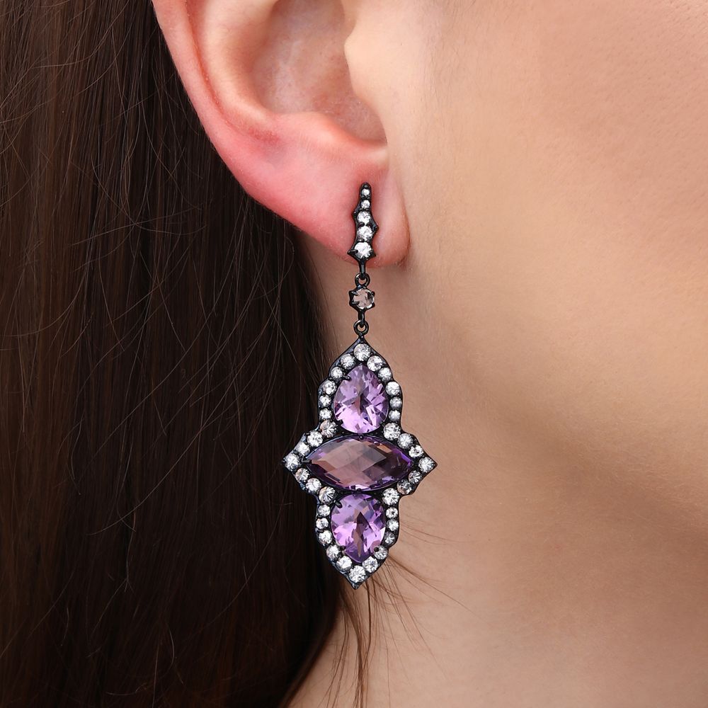 A cor violeta das ametistas transmite espiritualidade, equilíbrio e feminilidade, enquanto os topázios brancos iluminam a peça com leveza e elegância.
