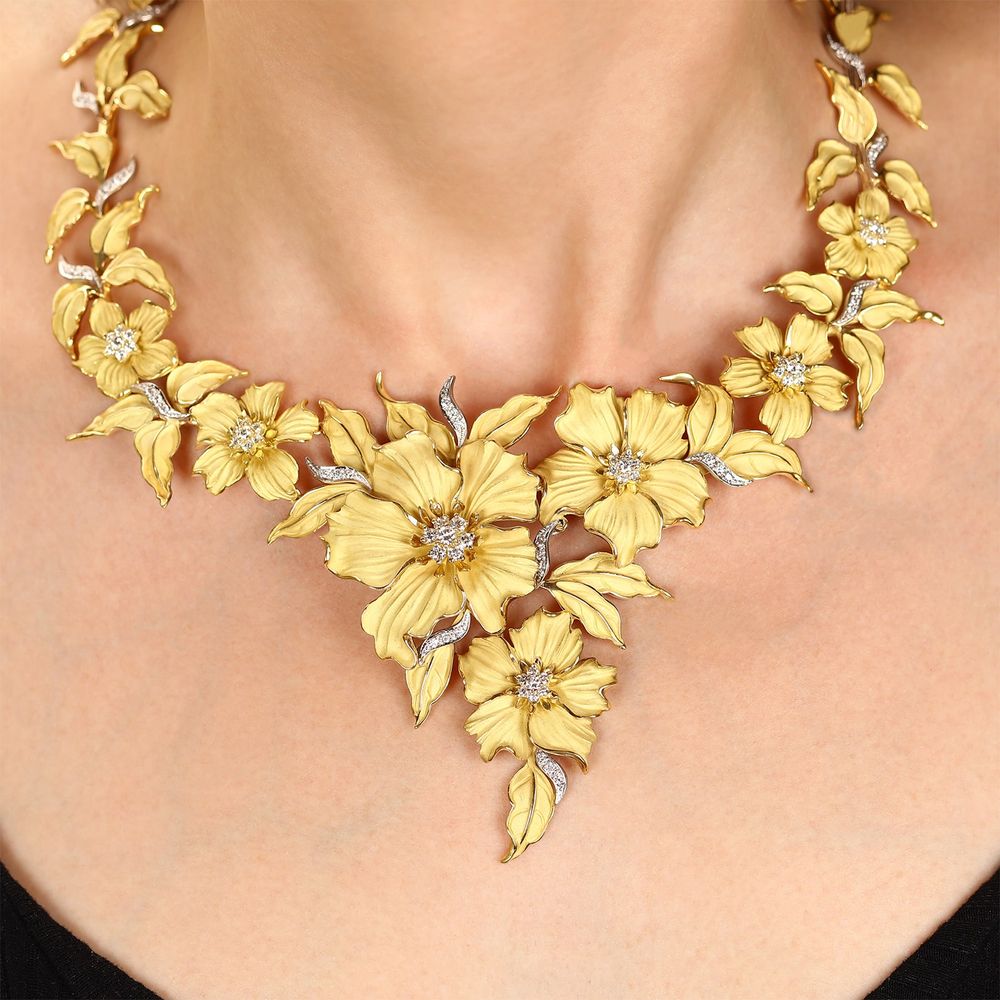 Tendo a natureza como inspiração, os melhores diamantes unem-se a um característico ouro acetinado para dar forma a flores, folhas, insetos e tudo mais que a imaginação possa sonhar.