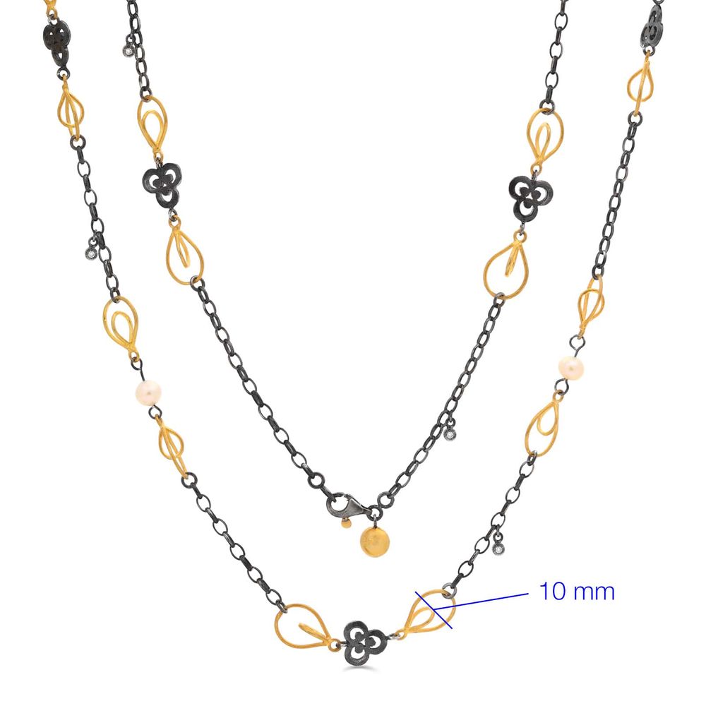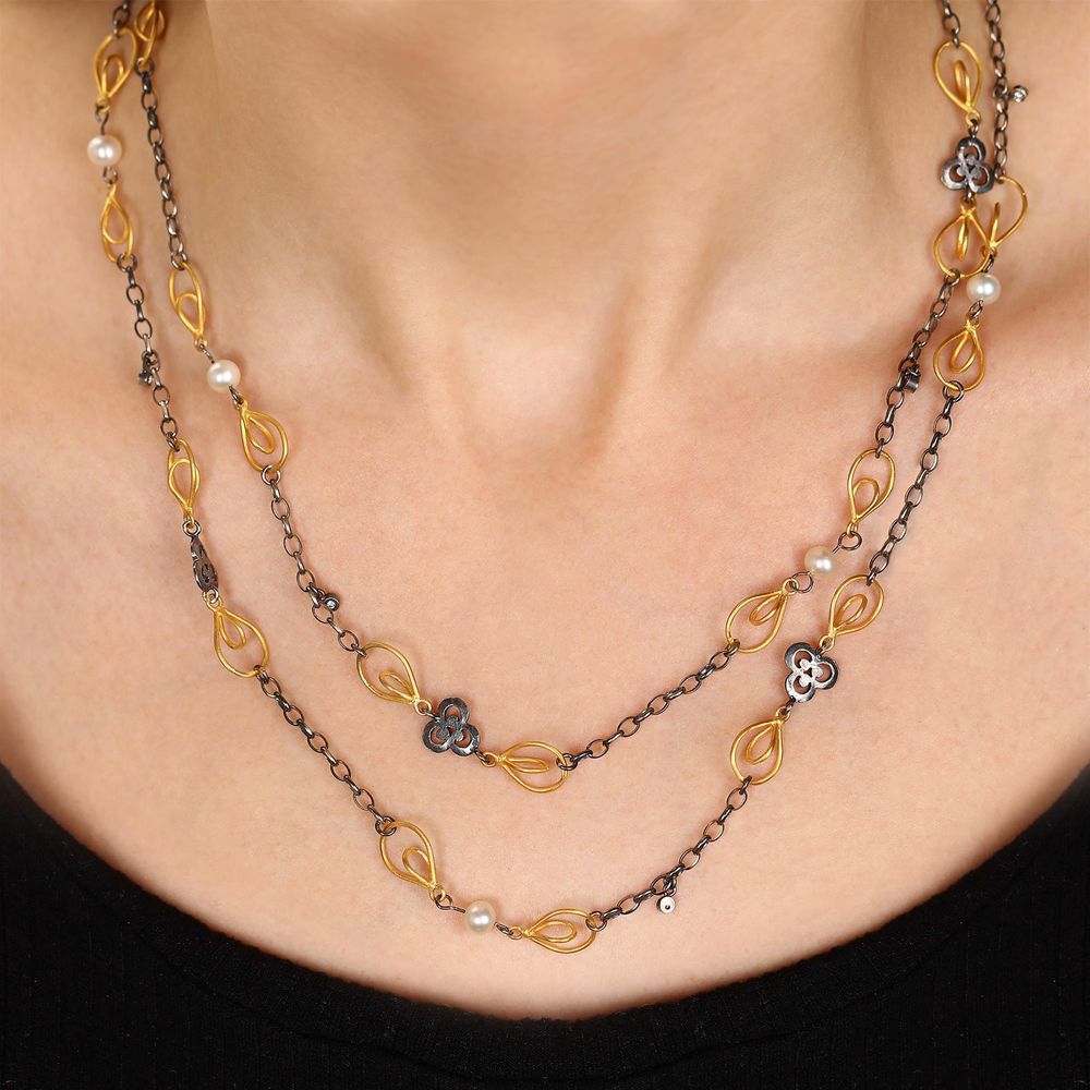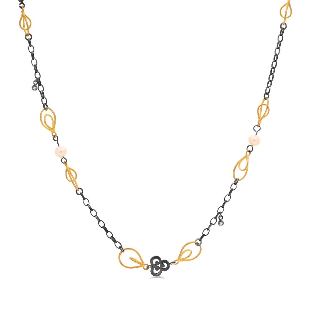 O colar é composto por pérolas baby e diamantes, trabalhado em prata e ouro 23,64K!