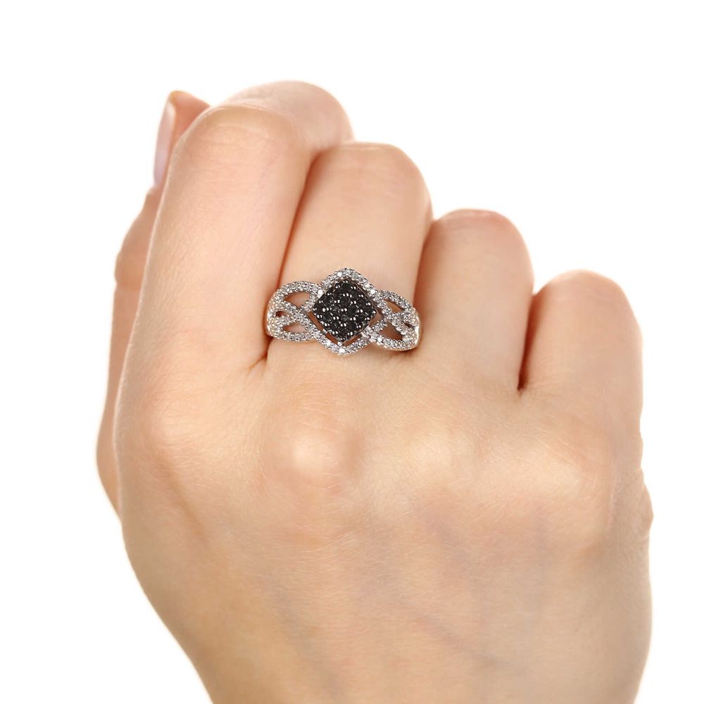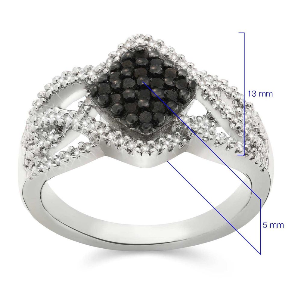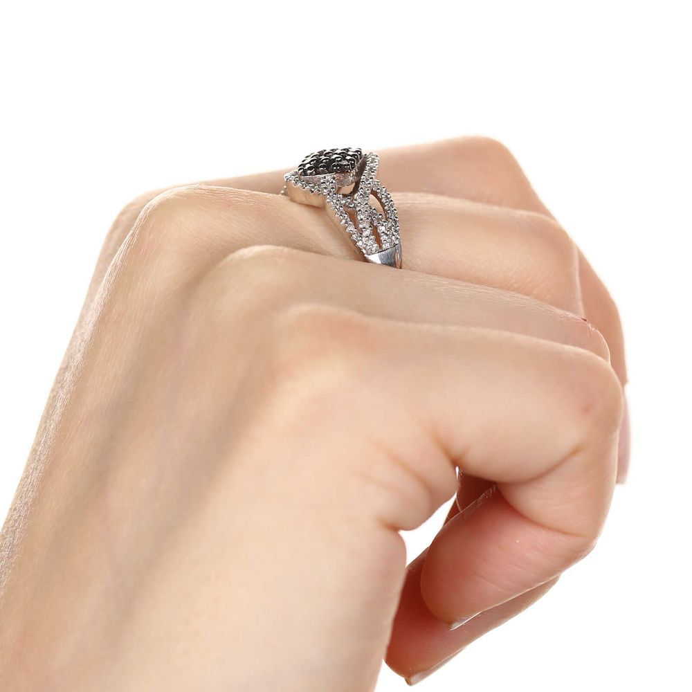 Anel de Prata Flor com Diamantes Negros e Brancos