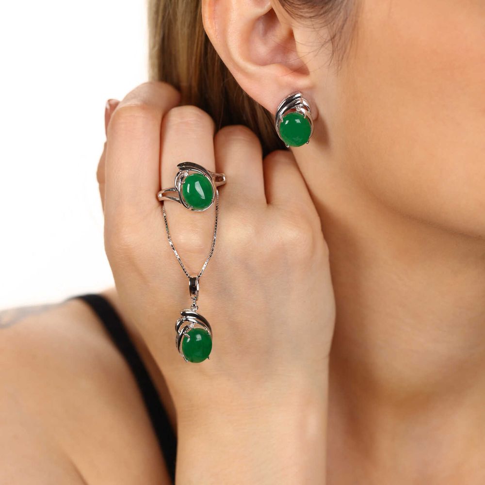 Cabochões de jade decoram o anel, o pingente e o par de brinco, todos estruturados com delicadeza na prata mais reconhecida do mercado de joalheria.