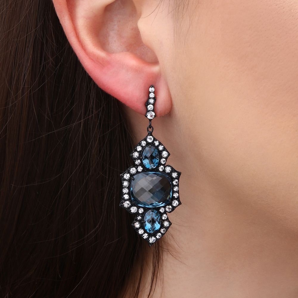O Par de Brincos Setara com Topázios Azuis em cortes retangular e oval, combinados ao brilho delicado dos topázios brancos, é uma peça de design elegante e imponente.