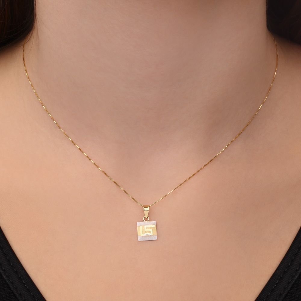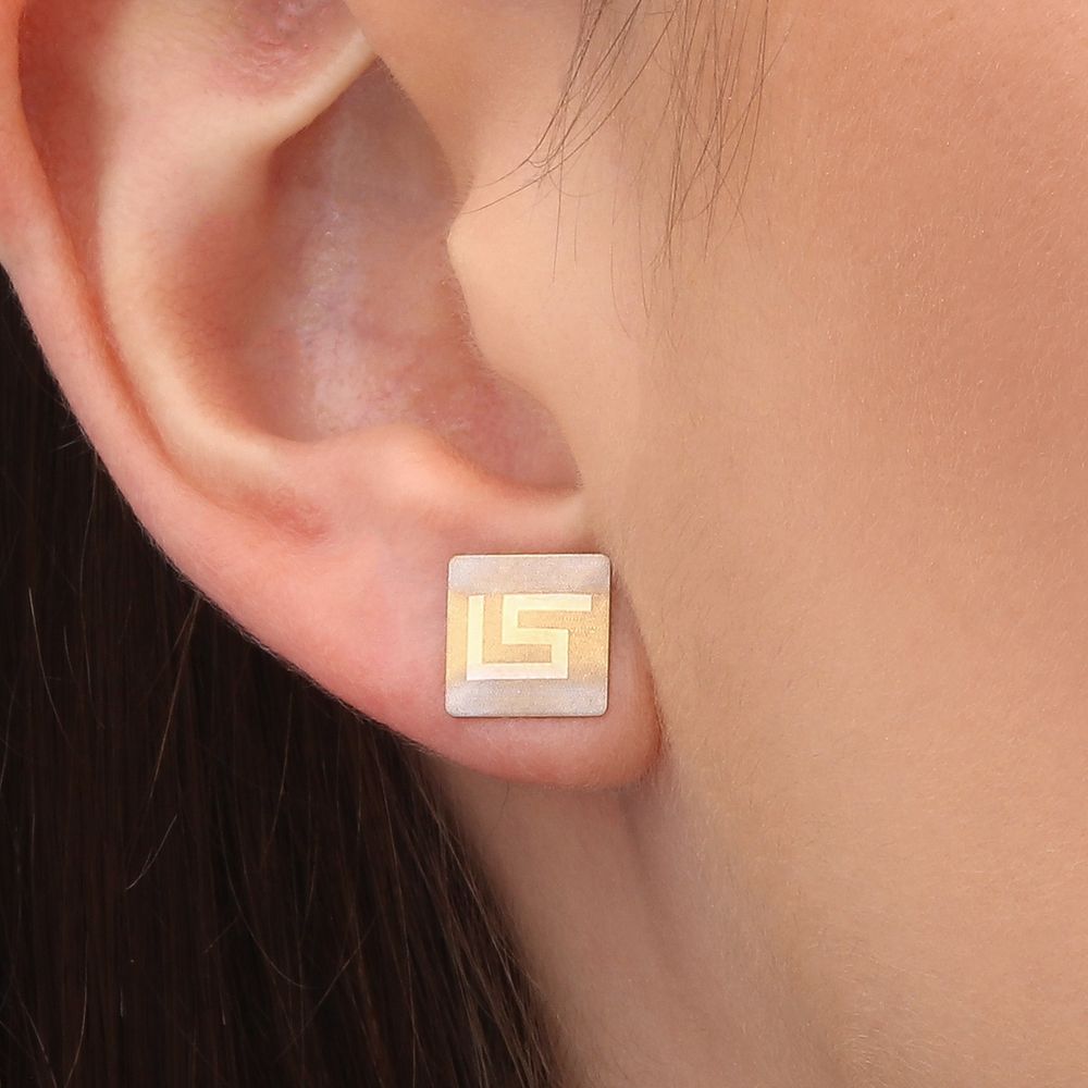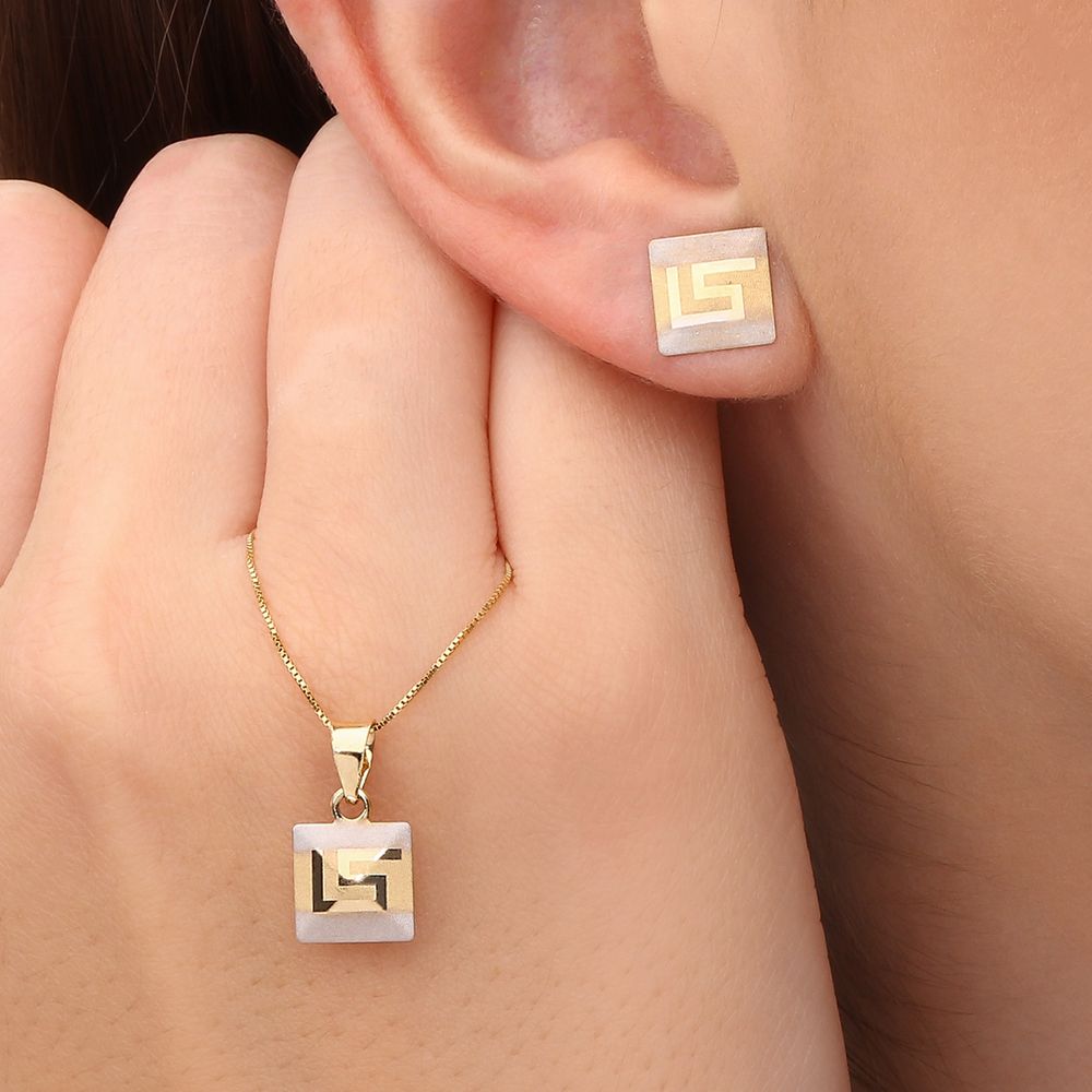 Par De Brinco e Pingente Quadrado em Ouro Amarelo 18k Com Detalhes Acetinados Em Ouro Branco 18k