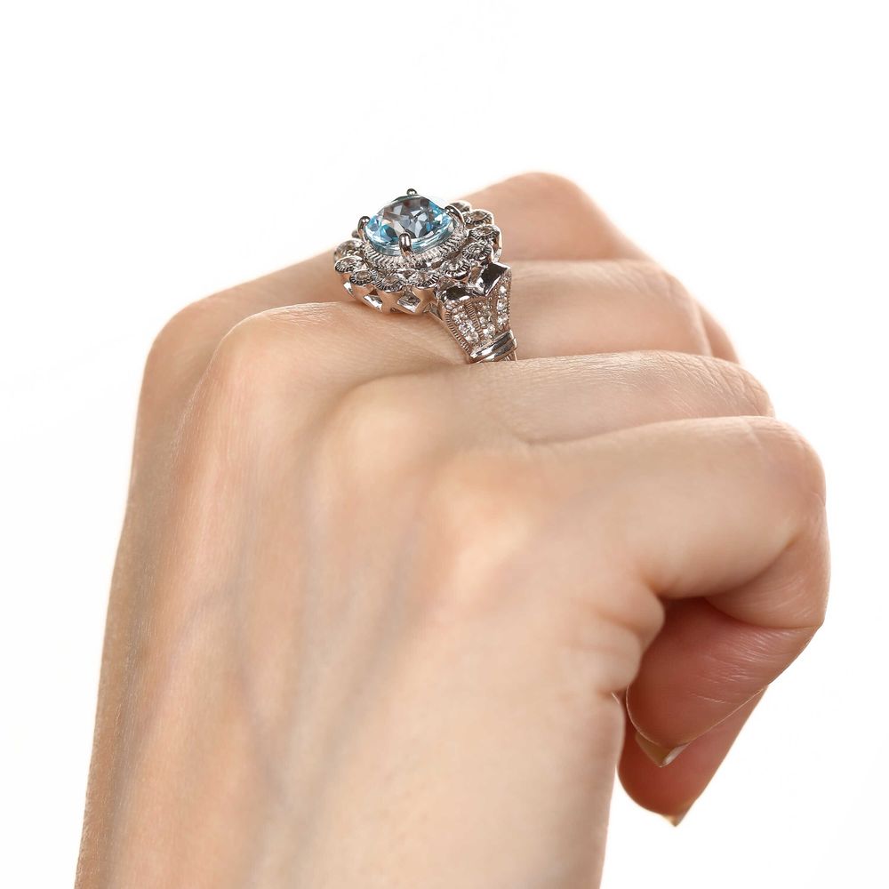 O anel é composto pela linda pedra central de topázio azul, envolto com topázios brancos.