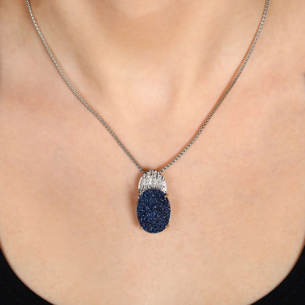 Em pedras: Quartzo Glitter Azul (7,02 cts) e Topázio Branco