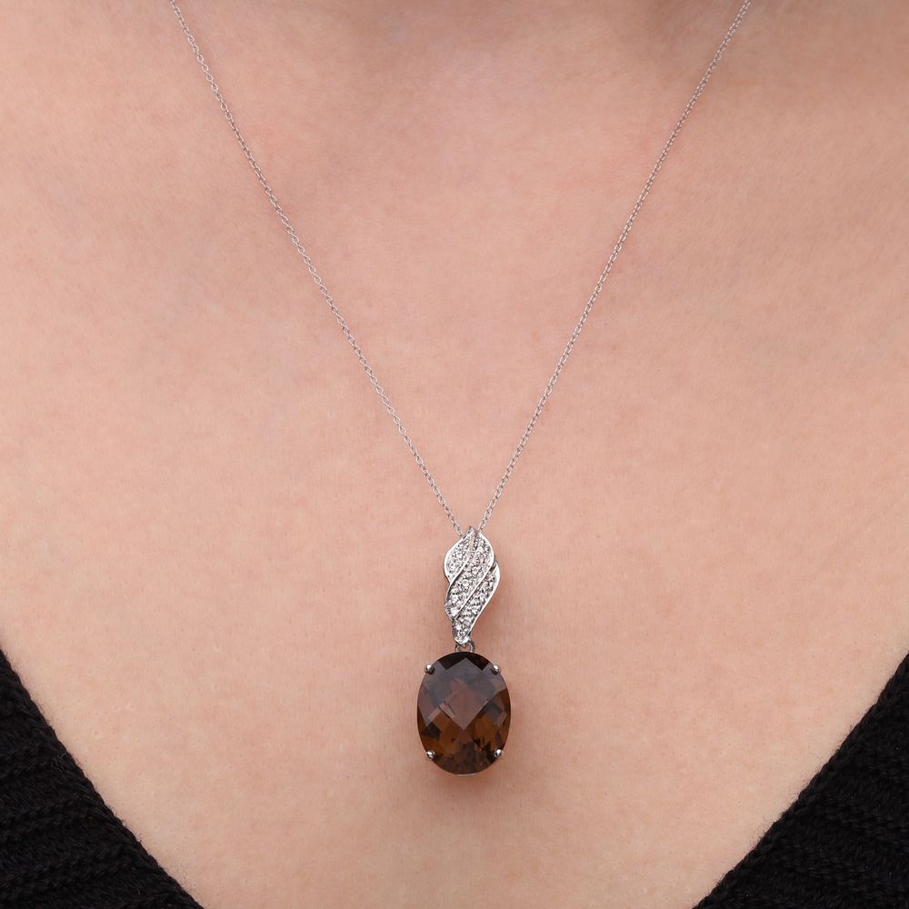 Esse pingente equilibra a profundidade marcante do quartzo fumê com o brilho sutil do topázio branco.