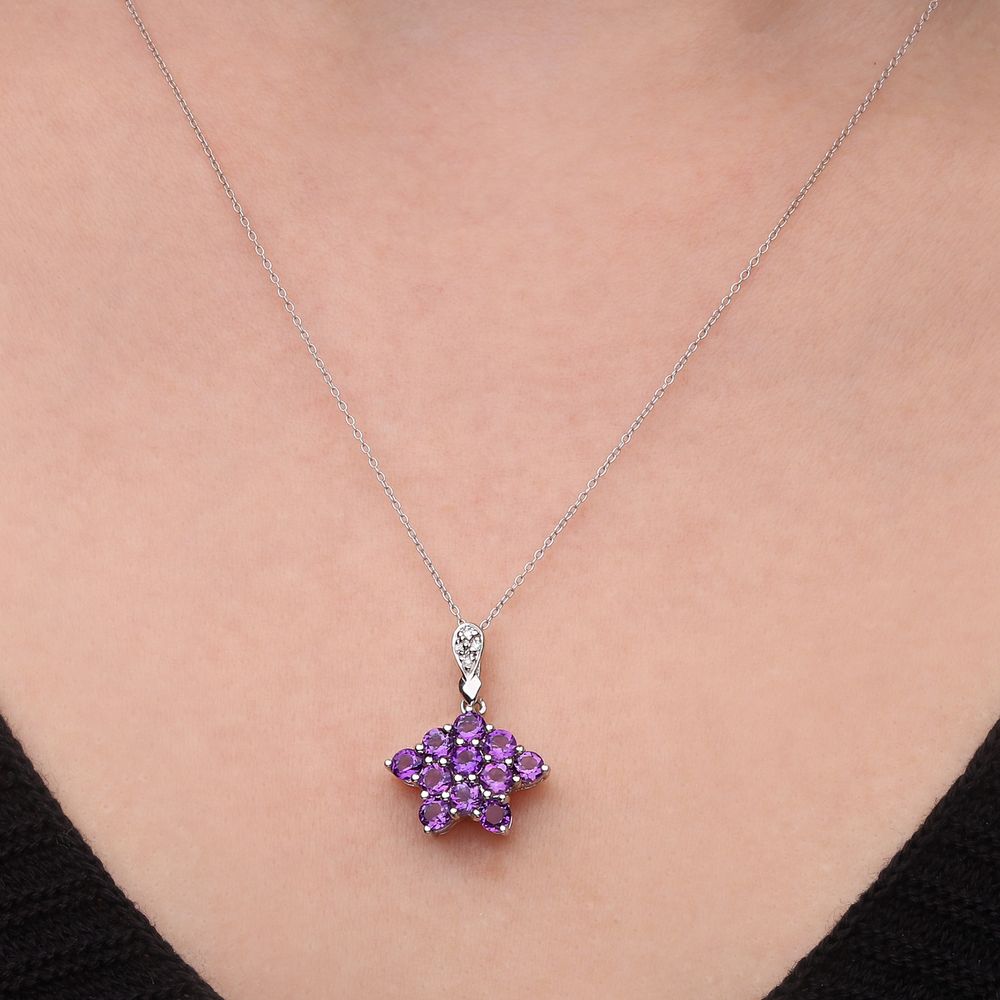 Com sua tonalidade violeta suave e brilho natural, o pingente com ametistas e diamante é a