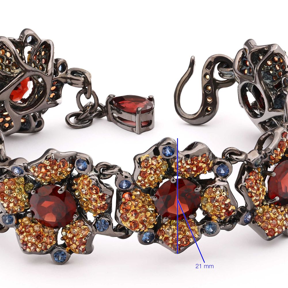 Em pedras: Granada (19,5 cts) e 666 Safiras Coloridas (8,54 cts) totalizando 28 cts em gemas.
