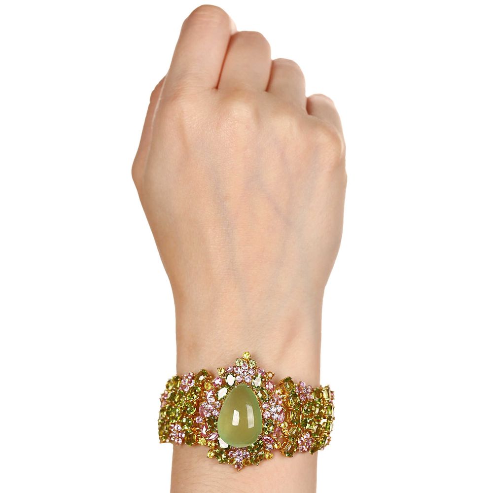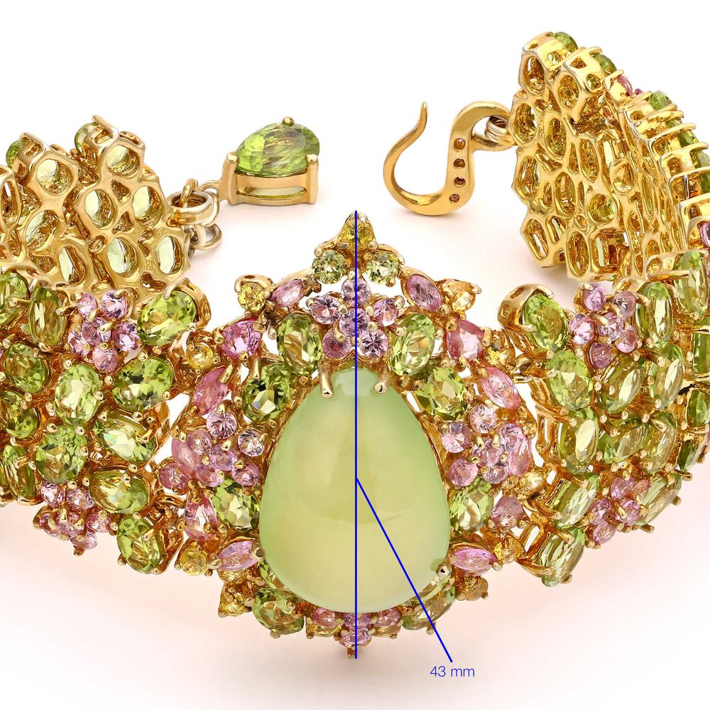 Em pedras: Prenita Gota (23,6 cts), 94 Peridotos (57,4 cts), 134 Safiras (6,06 cts) totalizando 87,06 cts em gemas.