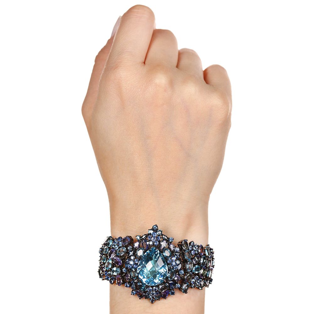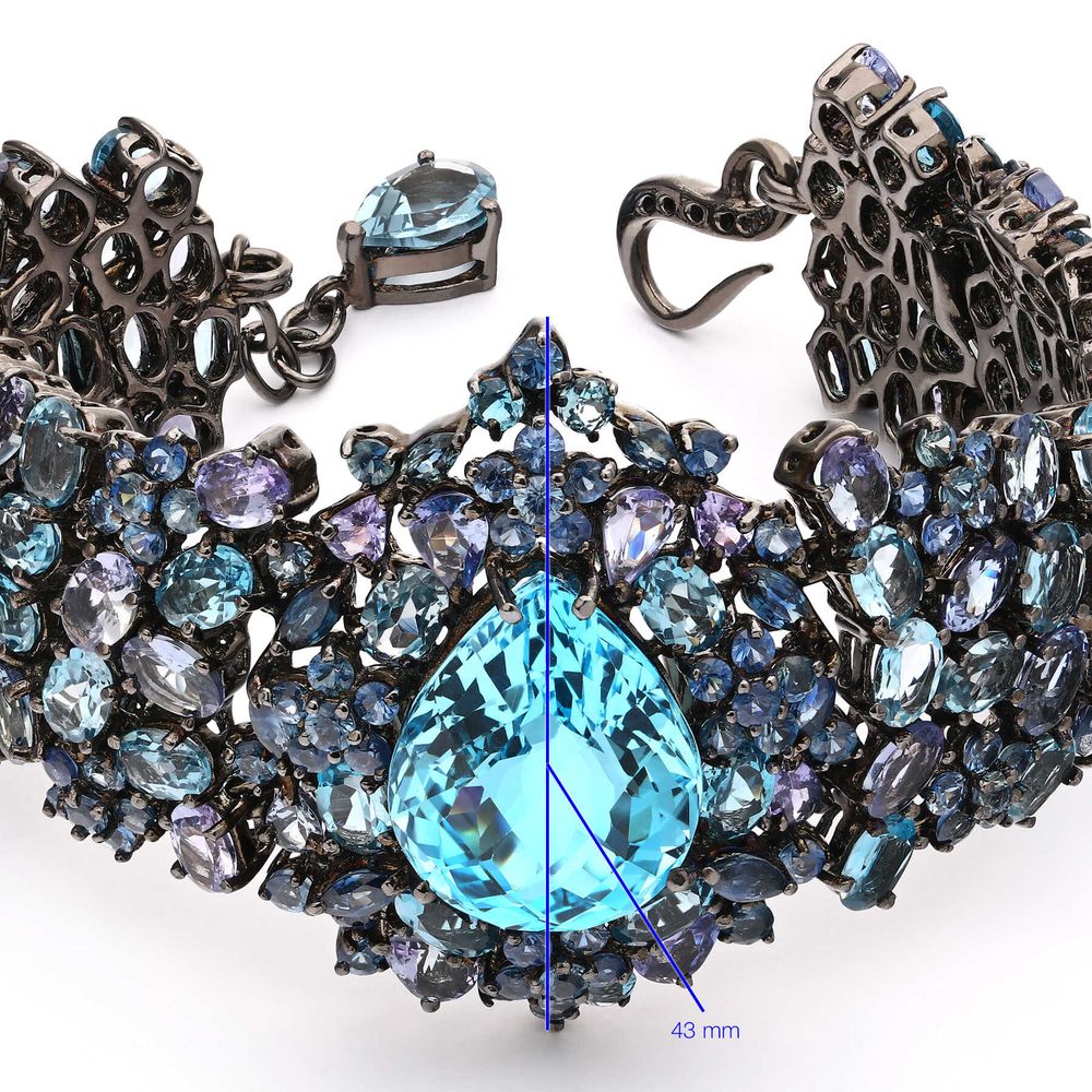 Em pedras: 56 Topázios Azuis (59,8 cts), 126 Safiras (5,52 cts) e 45 Tanzanitas (22,5 cts) totalizando 87,82 cts em gemas.