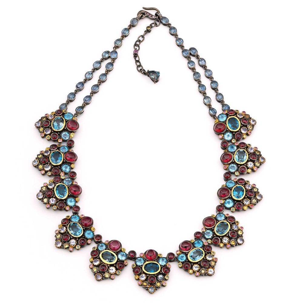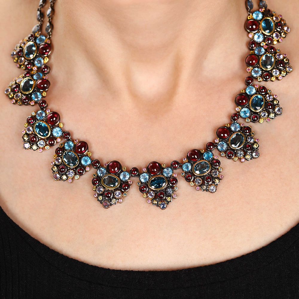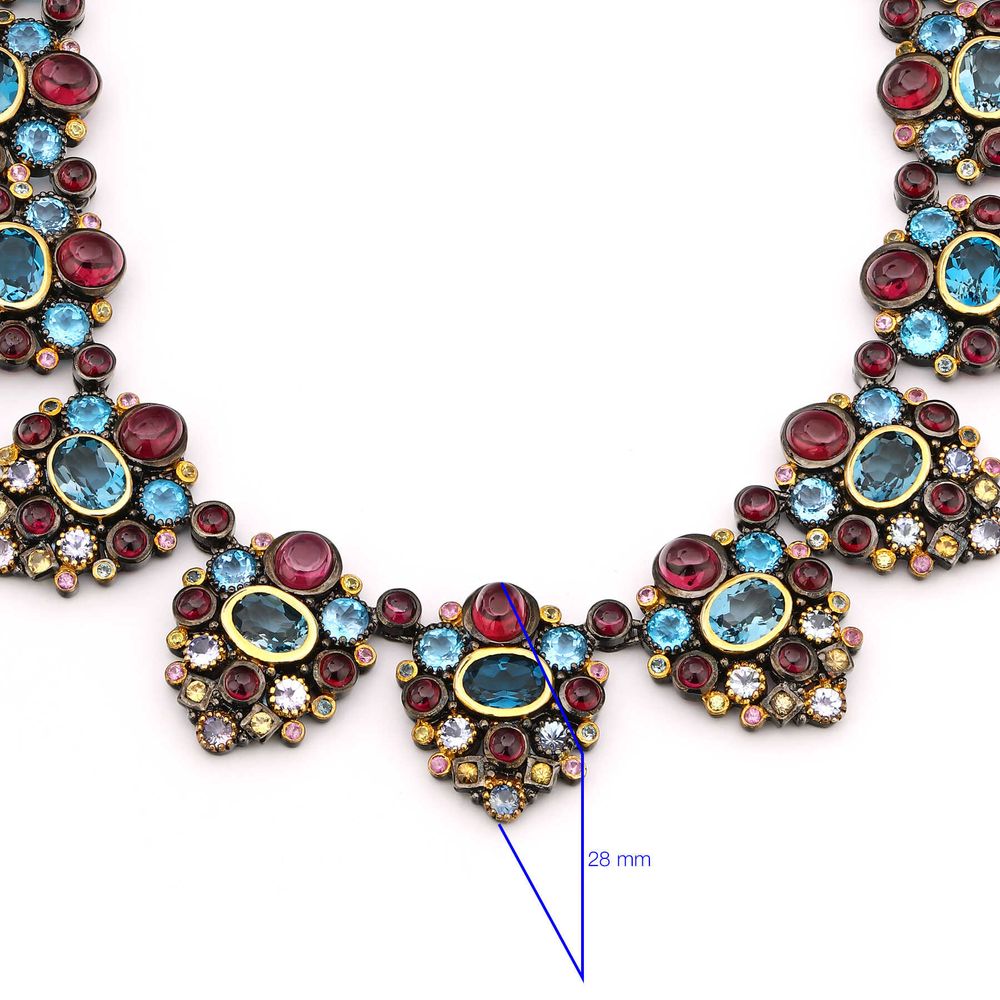 Em pedras: 145 Safiras (19,1 cts), 34 Topázio London Blue (50,1 cts), 54 Rodolita (31,6 cts) e 33 Tanzanitas (6,6 cts)