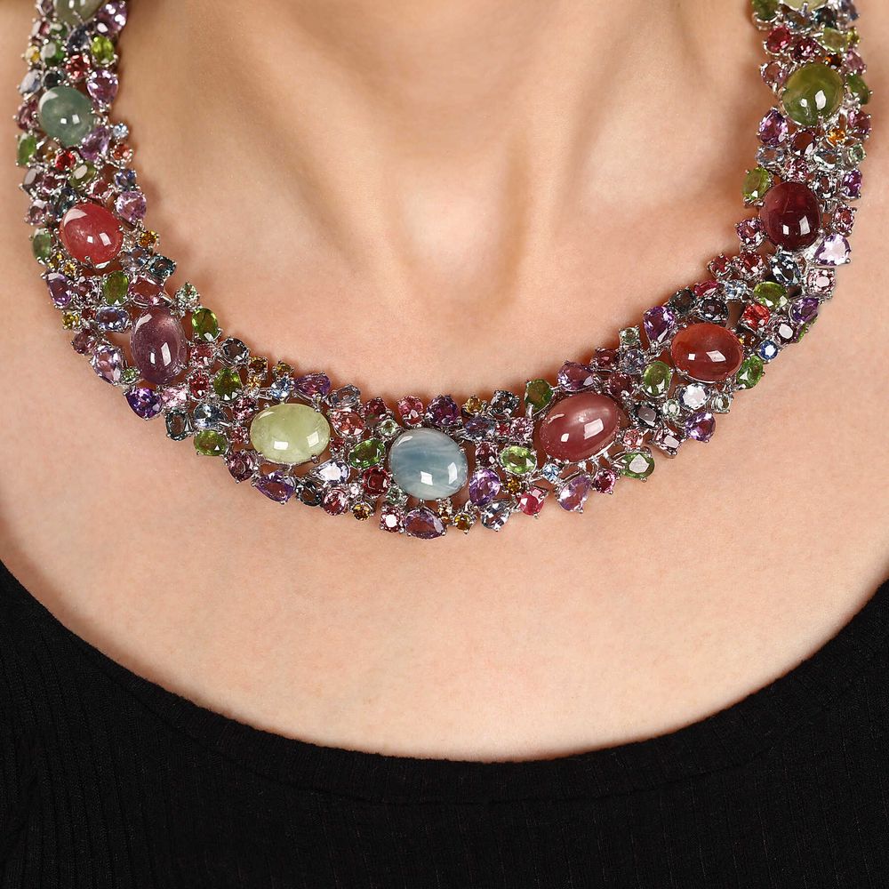 Em pedras: Ametistas, Topázios, Turmalinas, Safiras e Peridotos. 240 pedras naturais totalizando 302,2 cts em gemas.