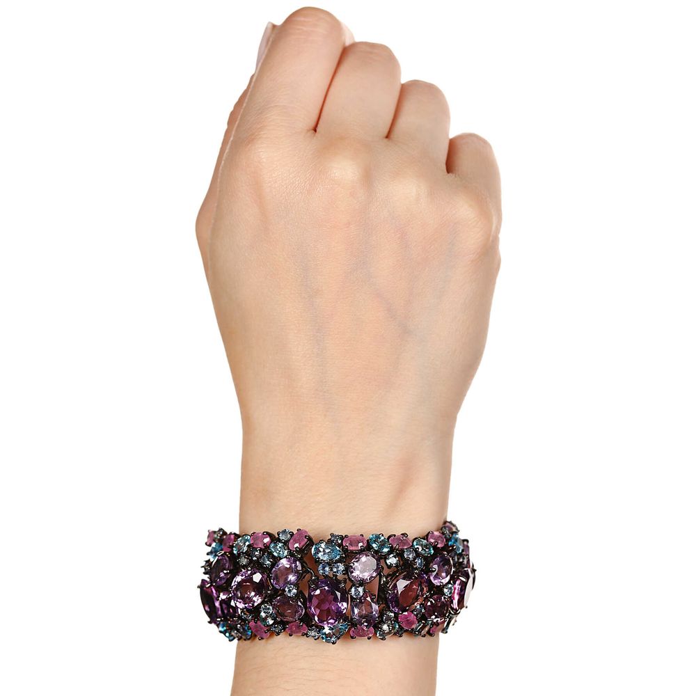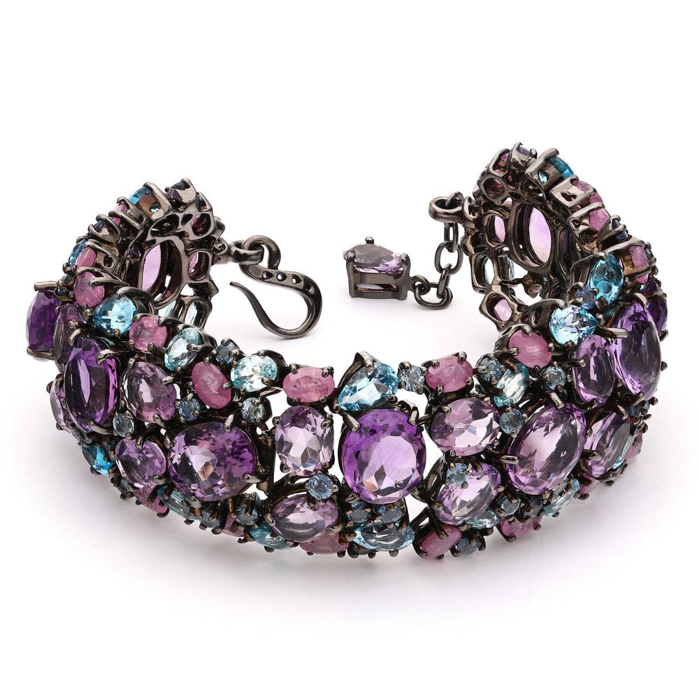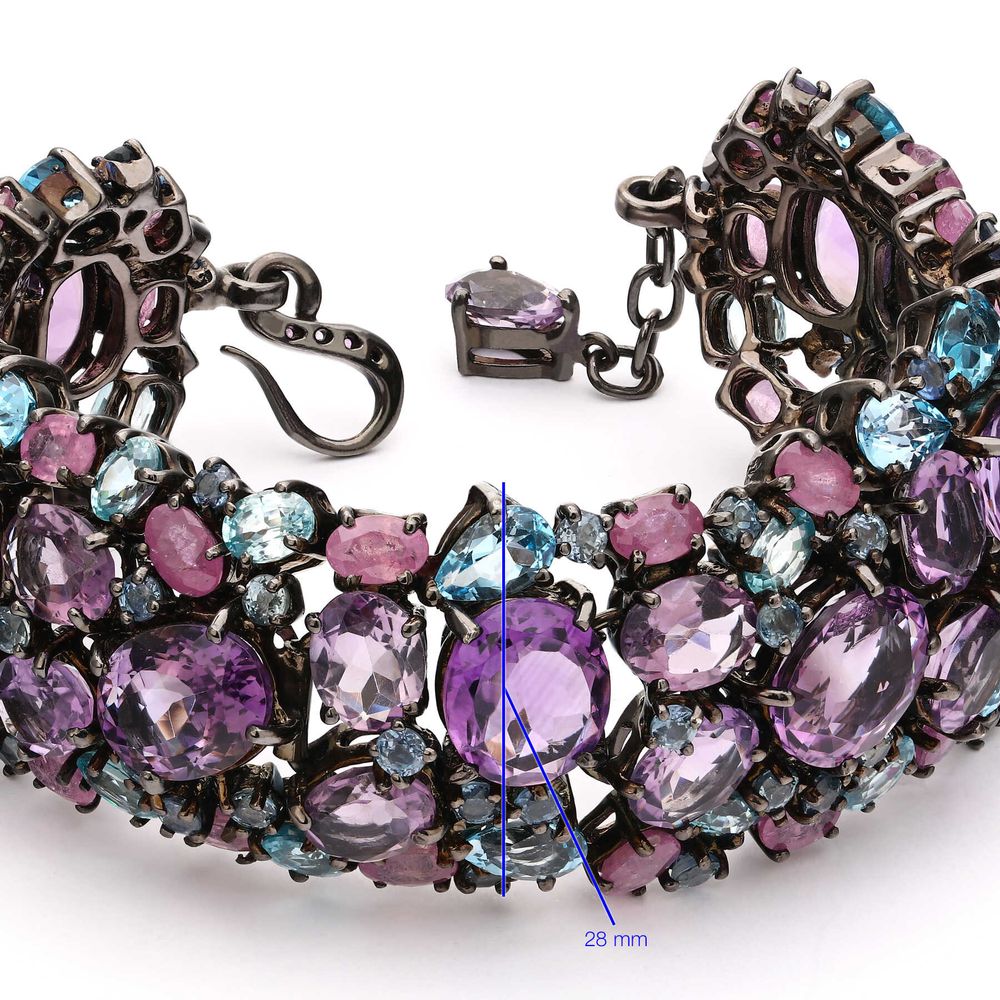 Em pedras: 26 Ametistas (67 cts), 76 Safiras (24,24 cts), 14 Topázios (14 cts) totalizando 114 cts em gemas.