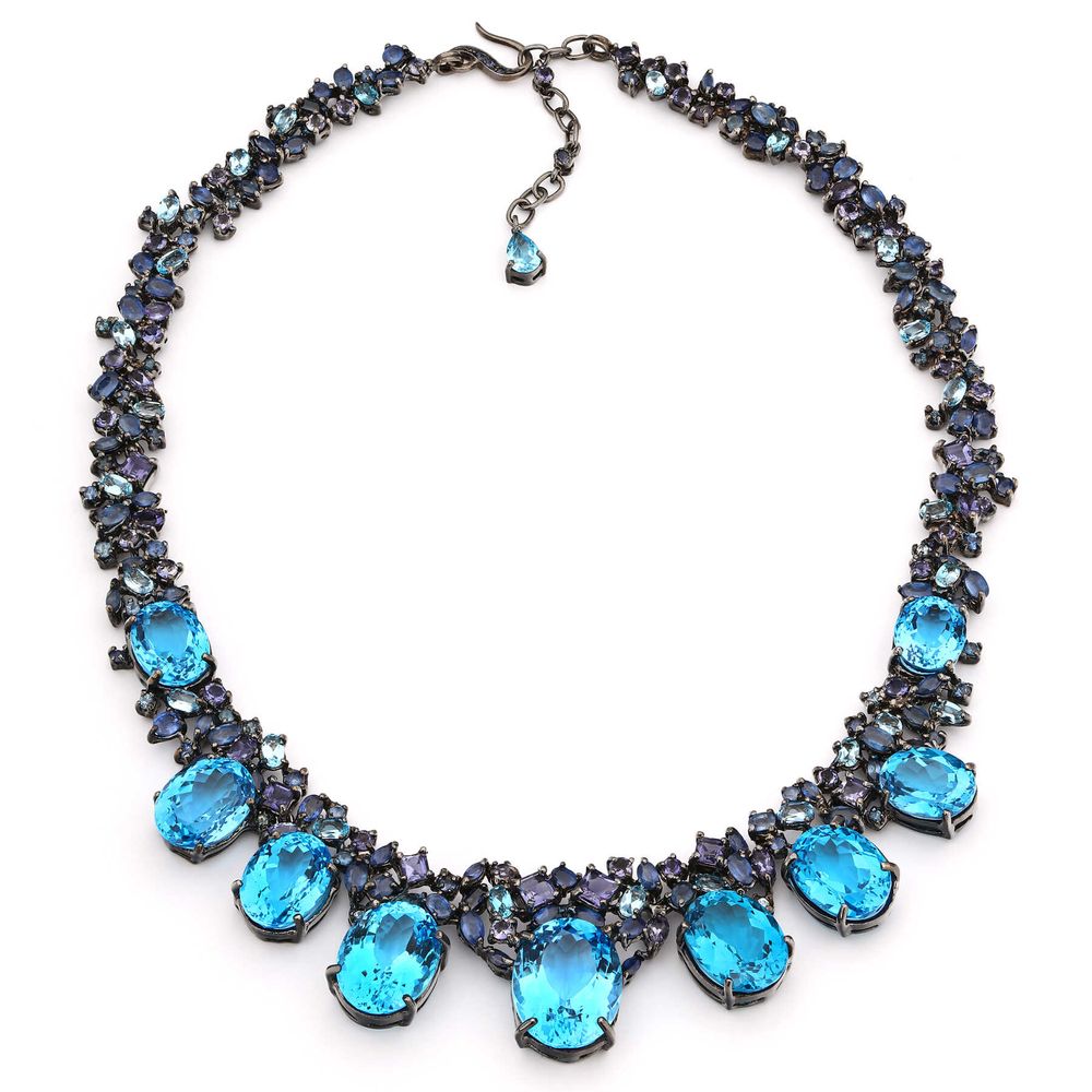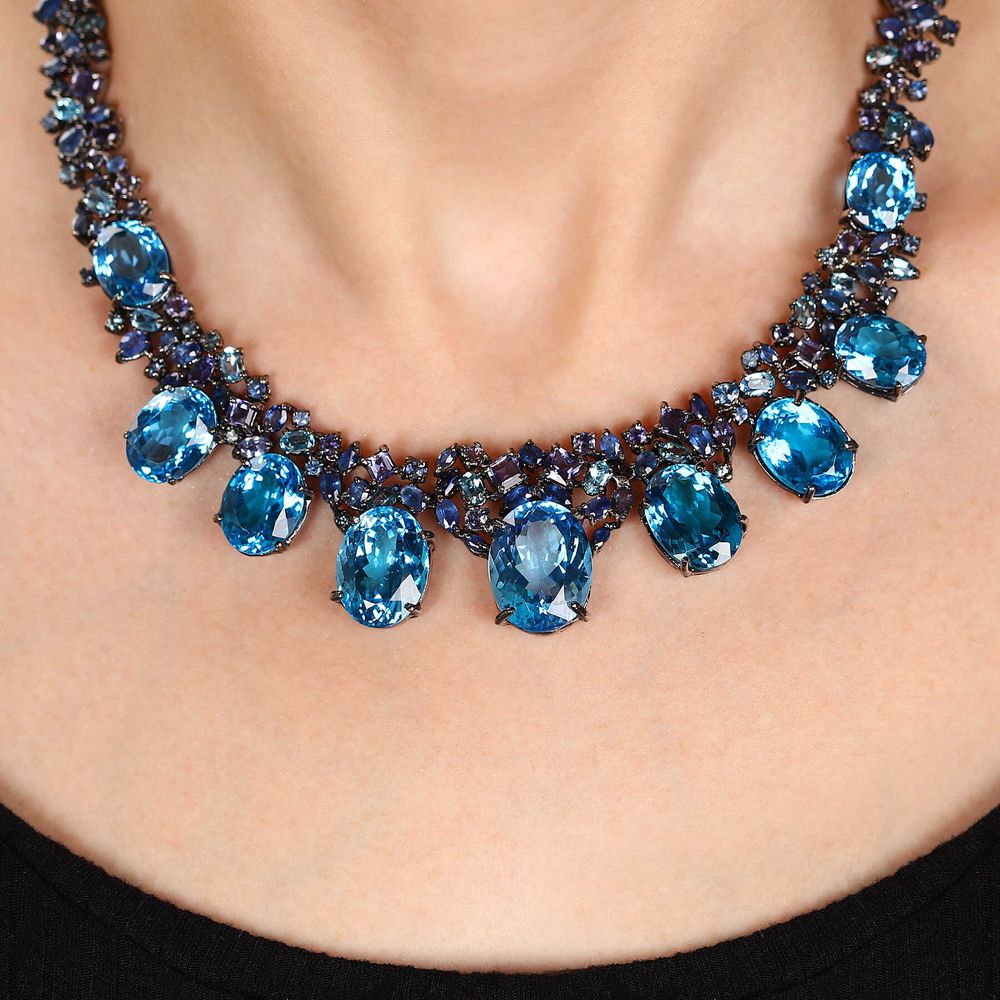 Em pedras: Topázio Azul (135,6 cts), 119 Safiras (8,1 cts), 43 Tanzanitas (4,3 cts) e 8 Iolitas (5 cts)