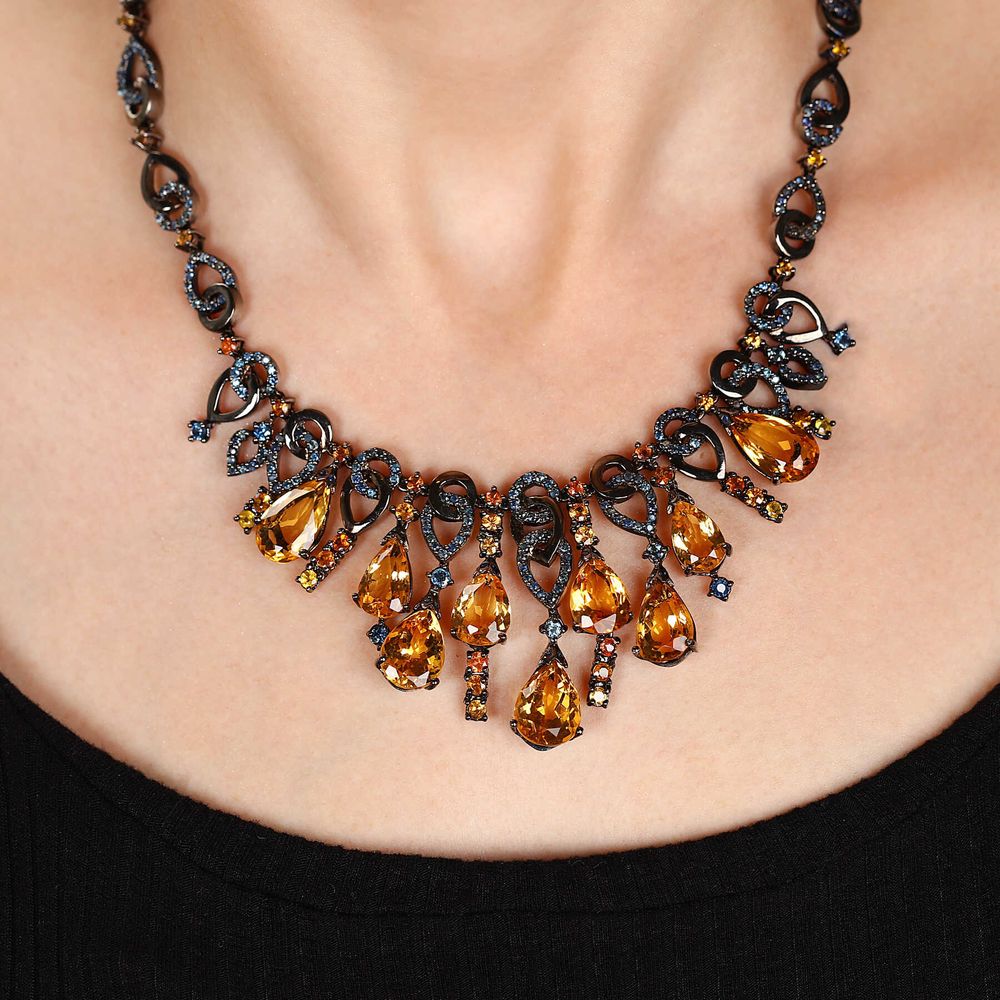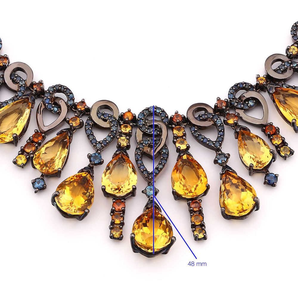 Em pedras: 100 Citrinos (47,4 cts), 353 Safiras Azuis (3,5 cts), 44 Safiras Laranjas (3,6 cts)