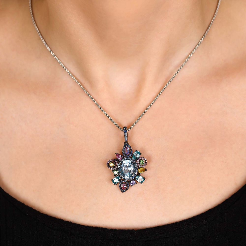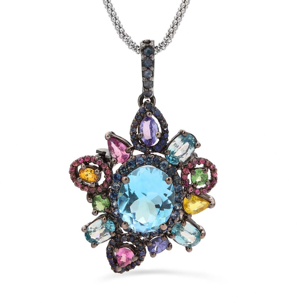 Em pedras: Topazios Azuis, Safiras Coloridas, Granadas Verdes e Tanzanitas (Aprox. 12 cts )