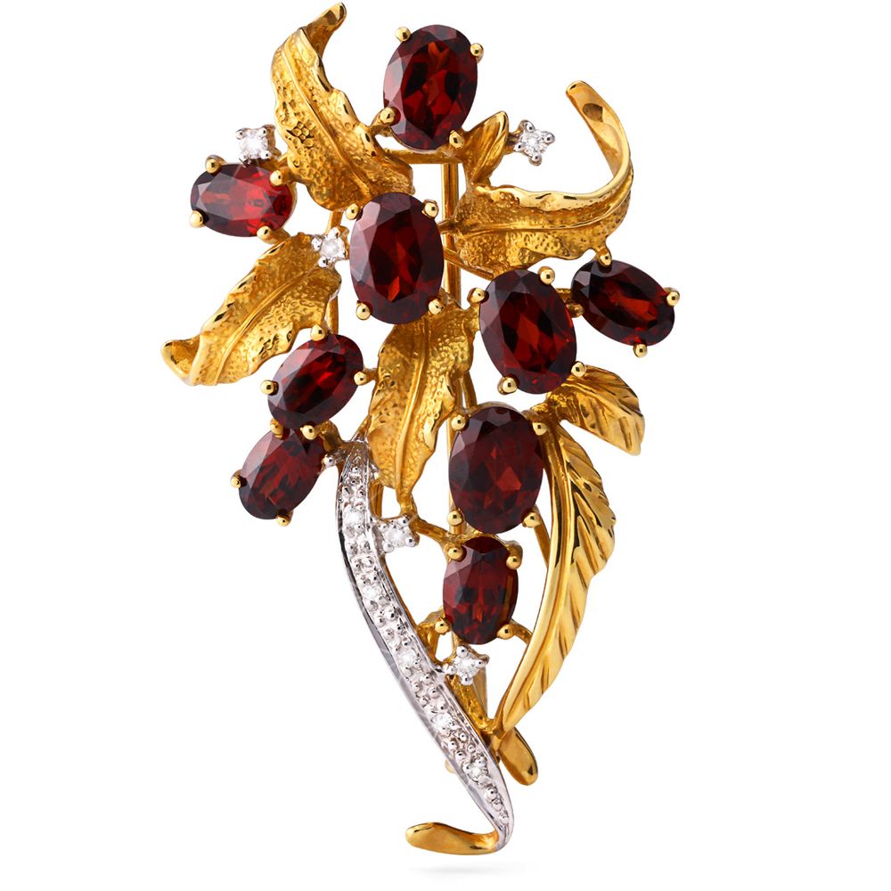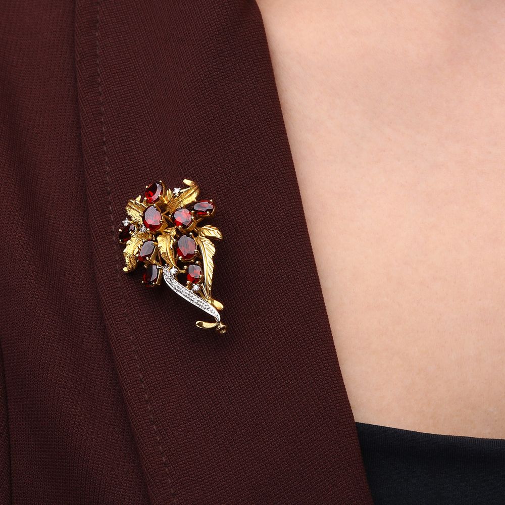 Seu design inspirado na natureza revela um visual harmonioso e feminino, destacando o brilho profundo das granadas aliado à sutileza dos diamantes.