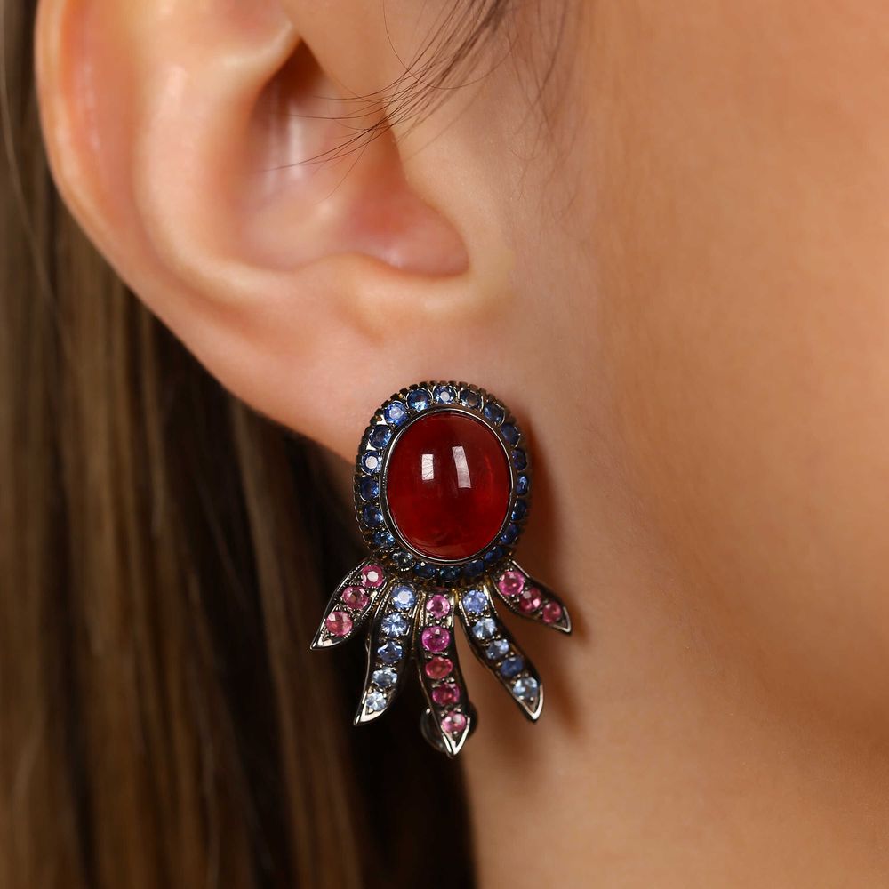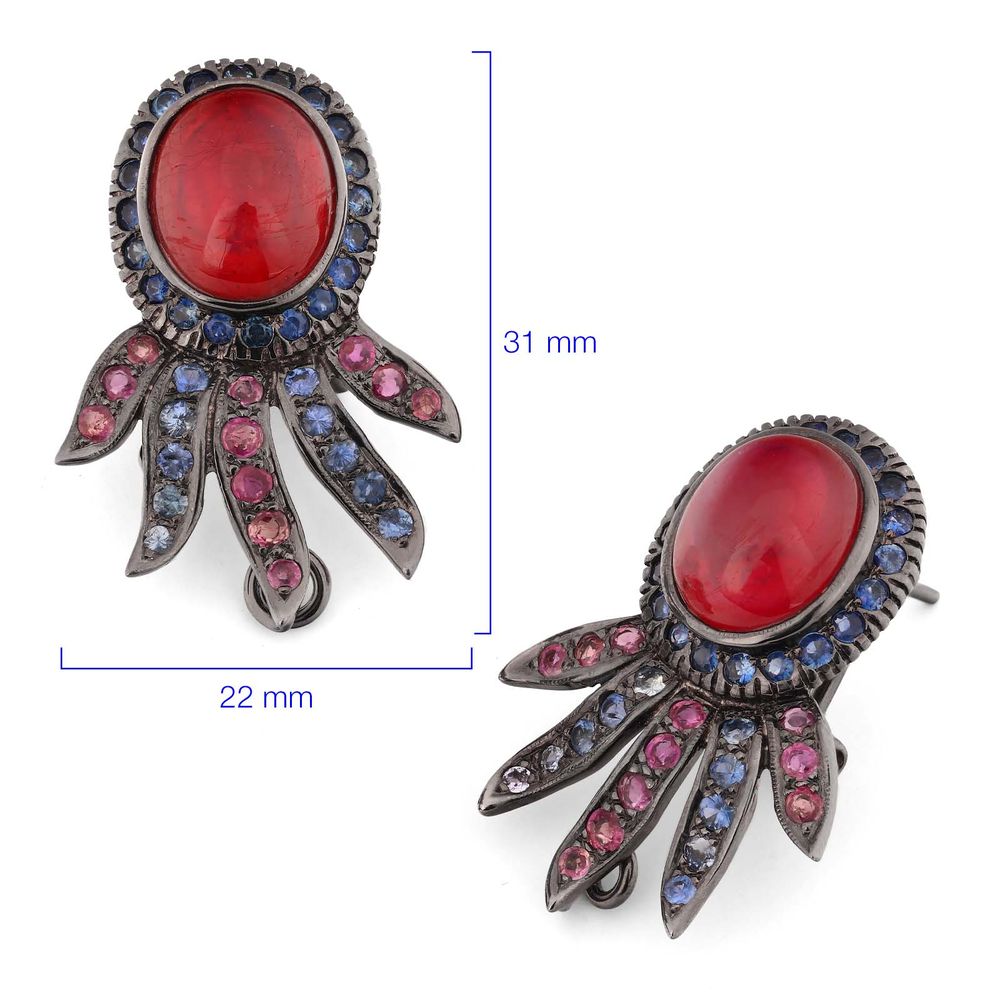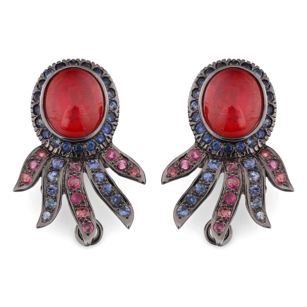 Par de Brinco de Prata Luxo com Rubis, Safiras Azuis e Safiras Rosas
