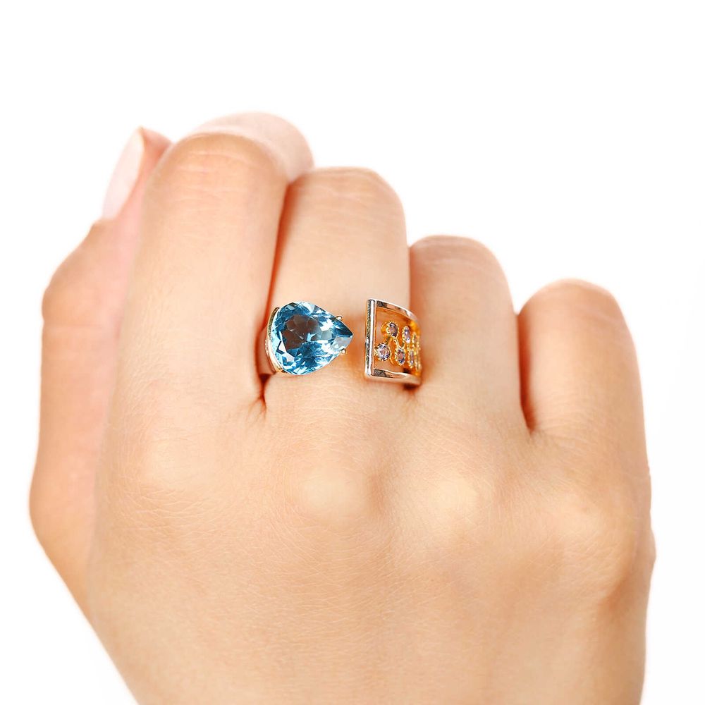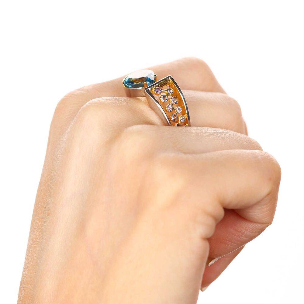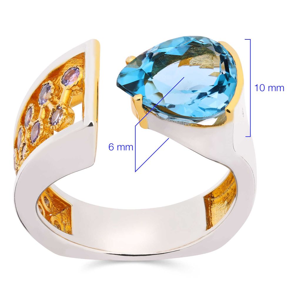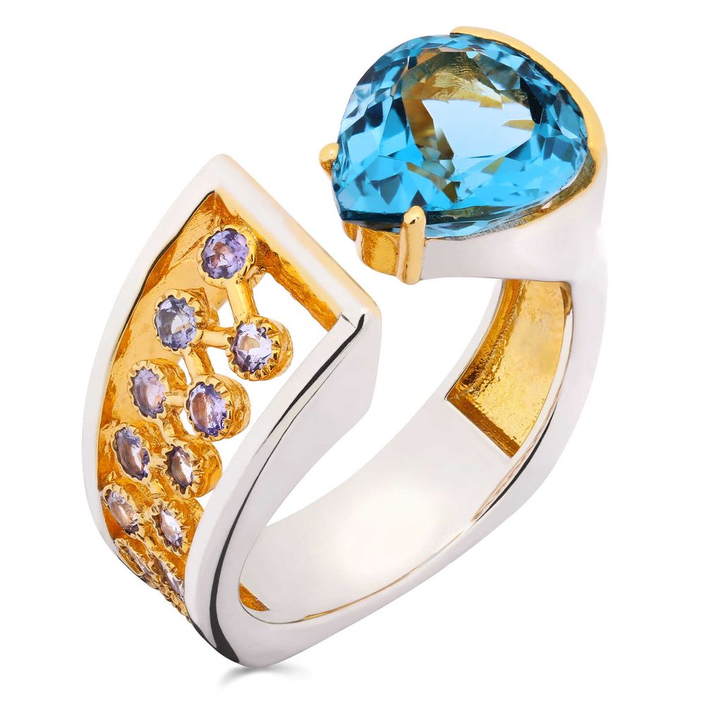 Anel Aro Desencontrado com London Blue e 14 Tanzanitas Aprox 4,9 Cts Prata