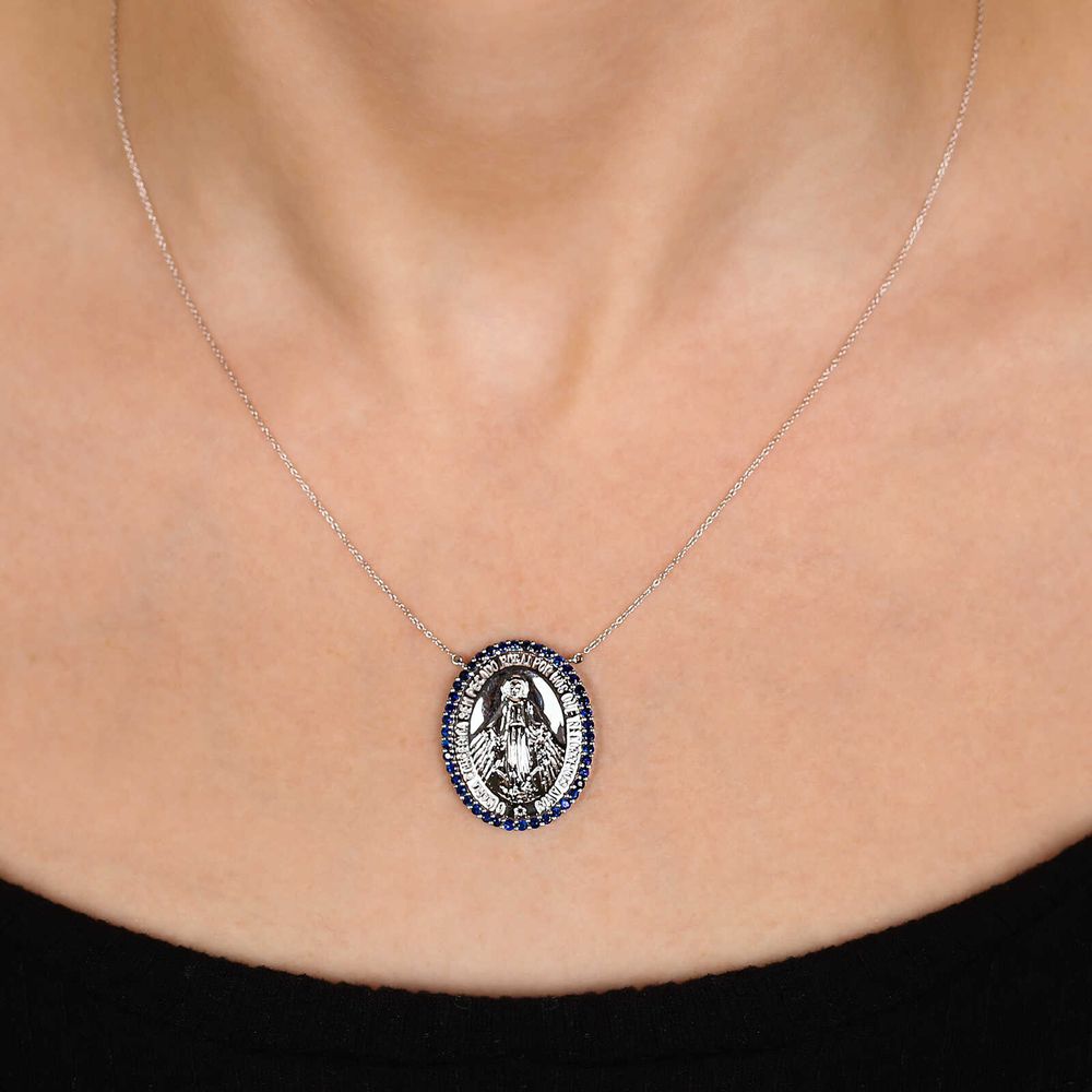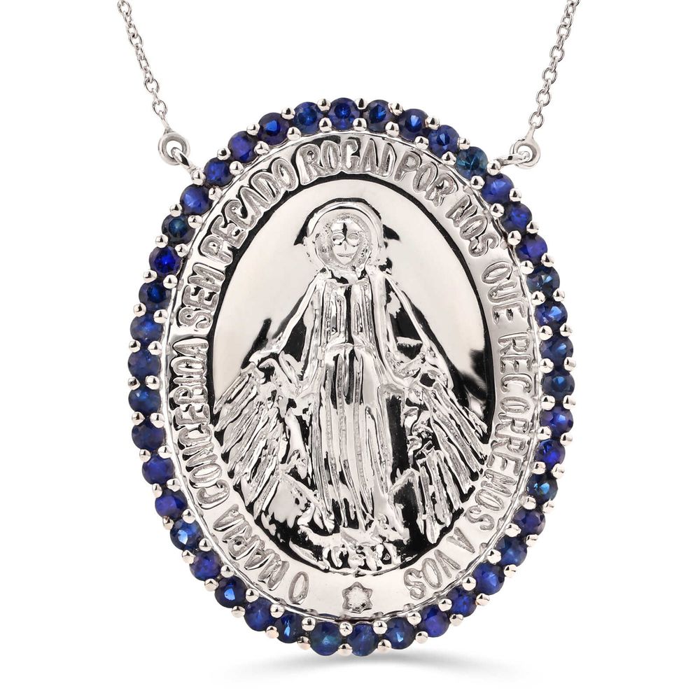 O pingente símbolo de religiosidade em combinação com as safiras e diamantes tornaram a peça delicada e perfeita.