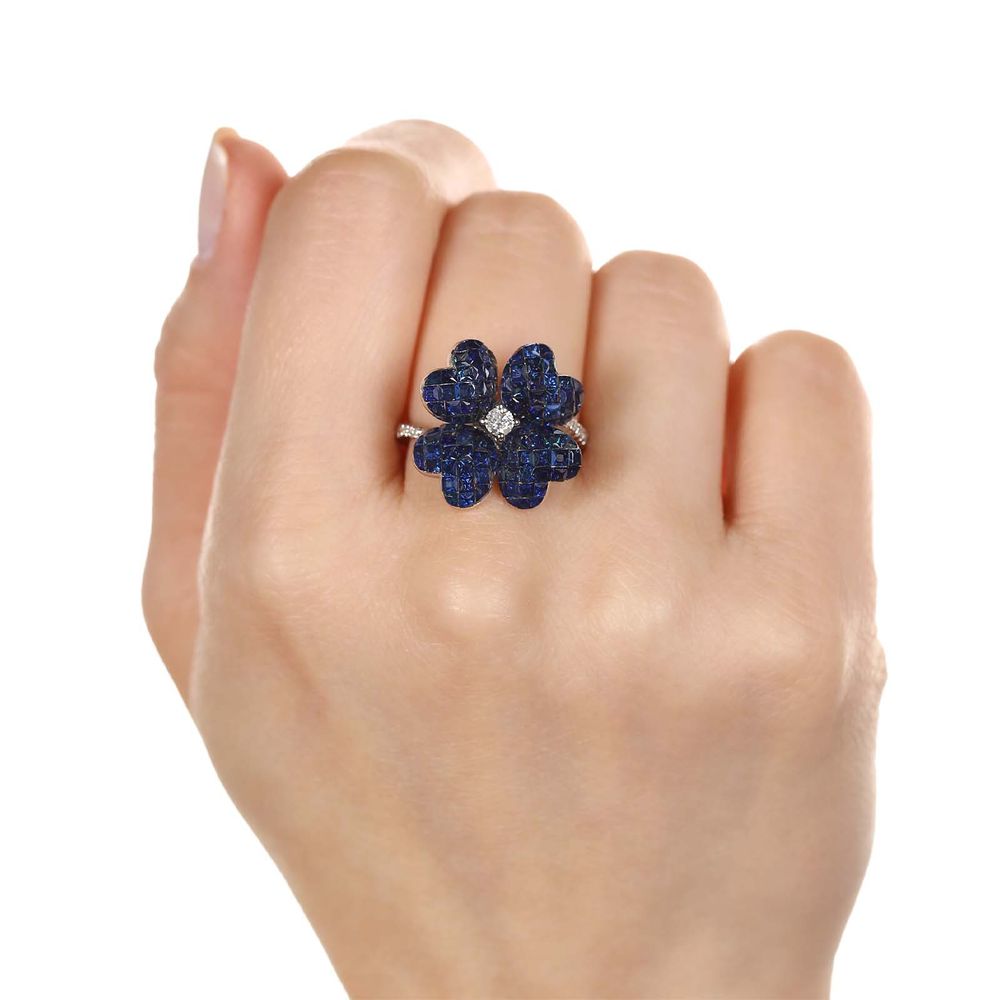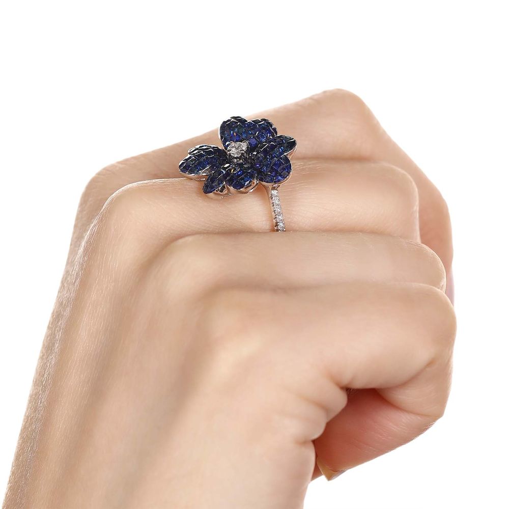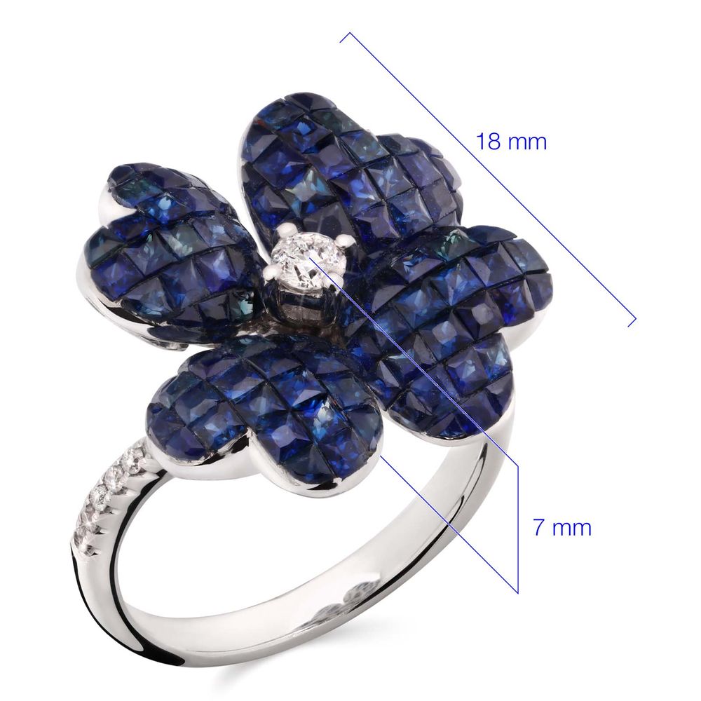 Anel de Ouro Flor com Safiras Azuis e Diamantes Brancos