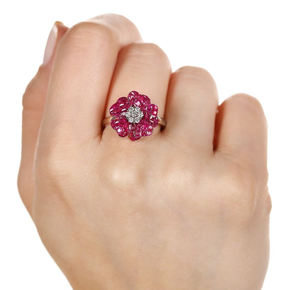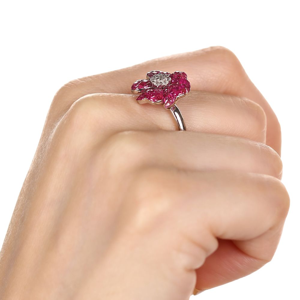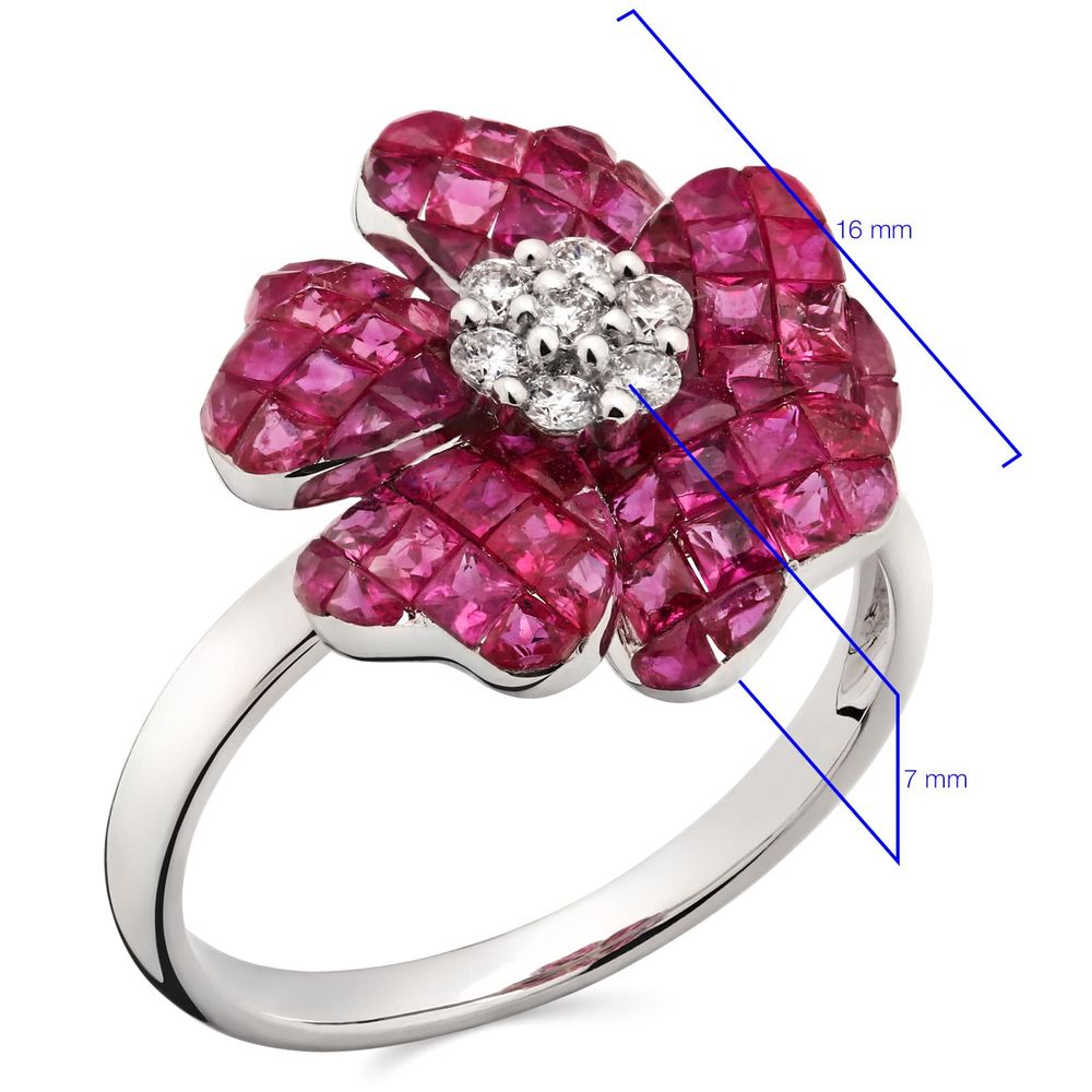 Anel de Ouro Flor com Rubis e Diamantes Brancos