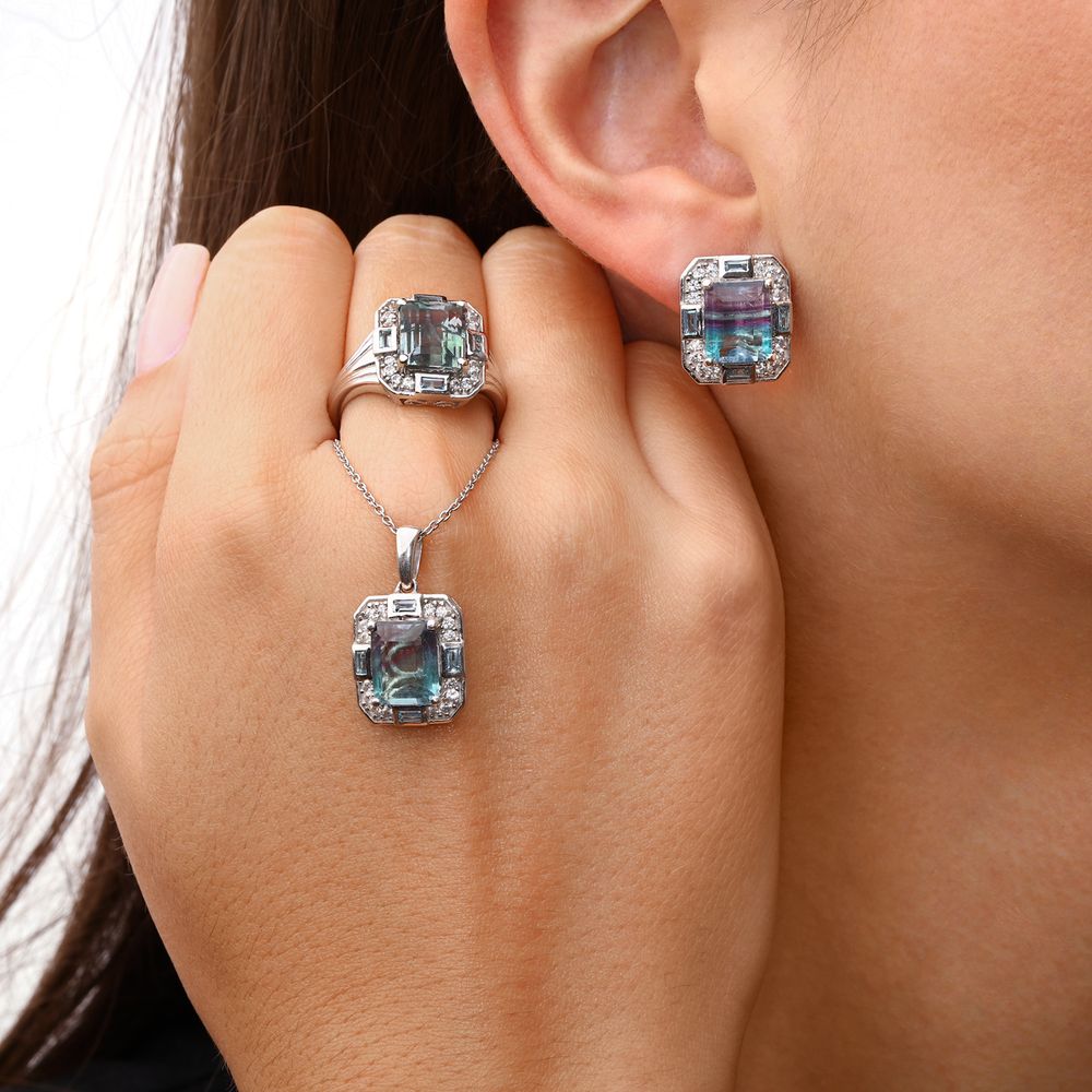 Conjunto Bicolor Anel brinco e pingente retangular Prata