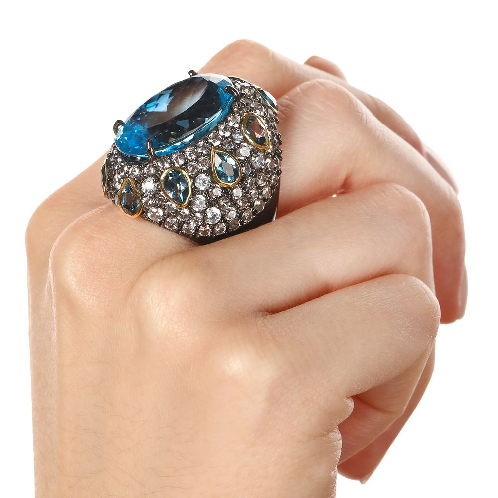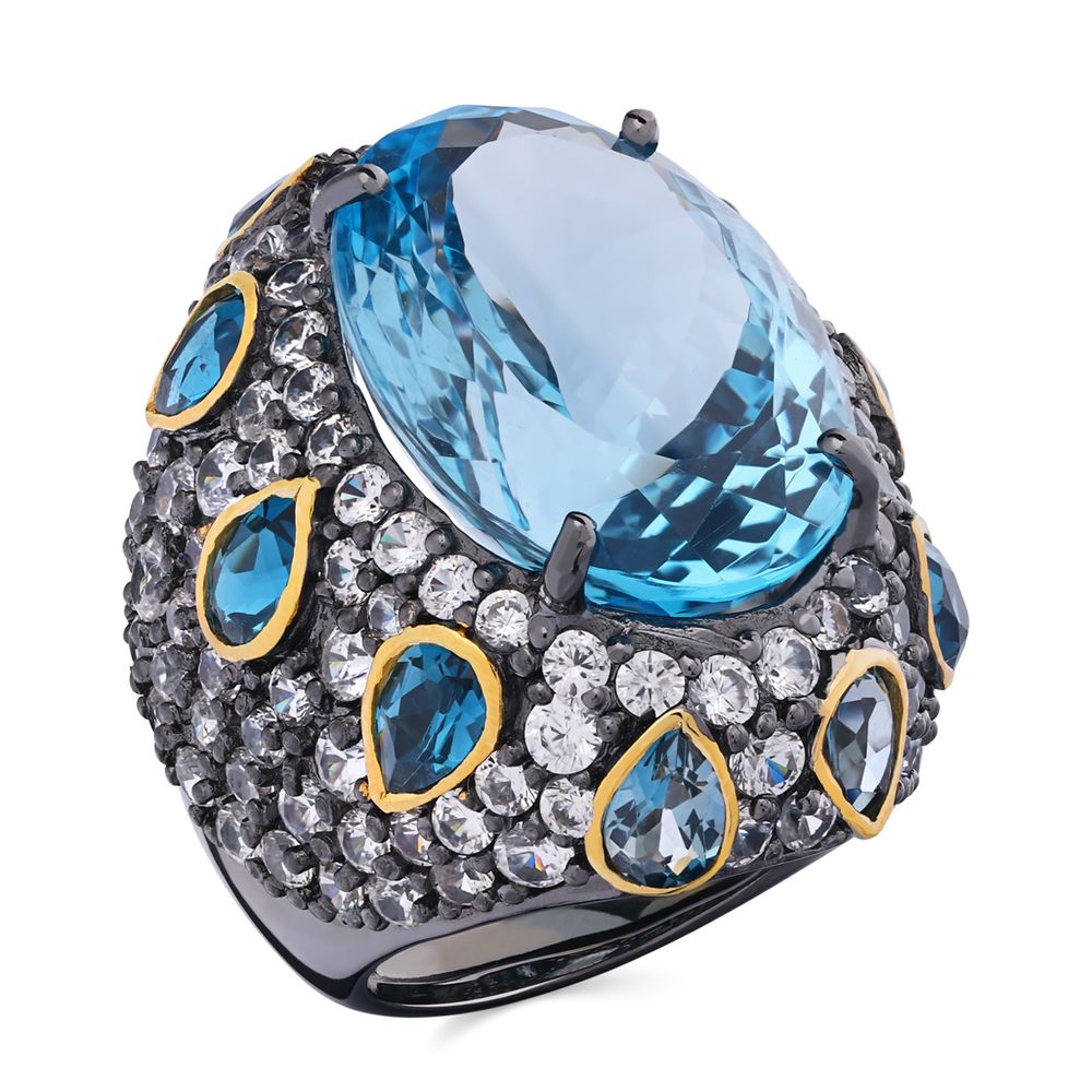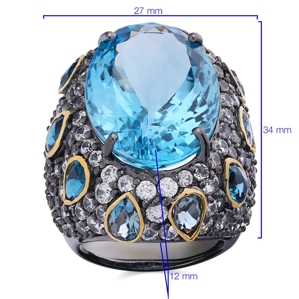 Anel Com Topázio Azul, Topázio London Blue e Zircônias (Aprox. 59 cts)