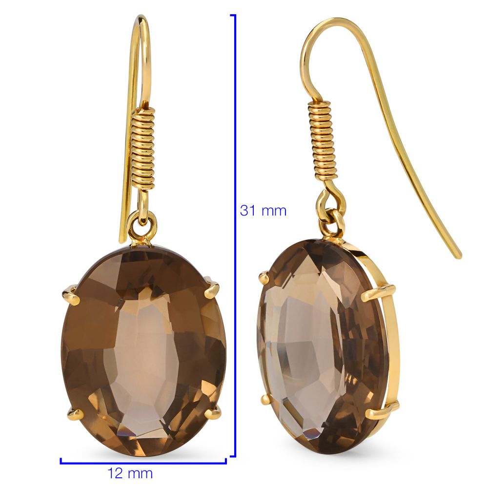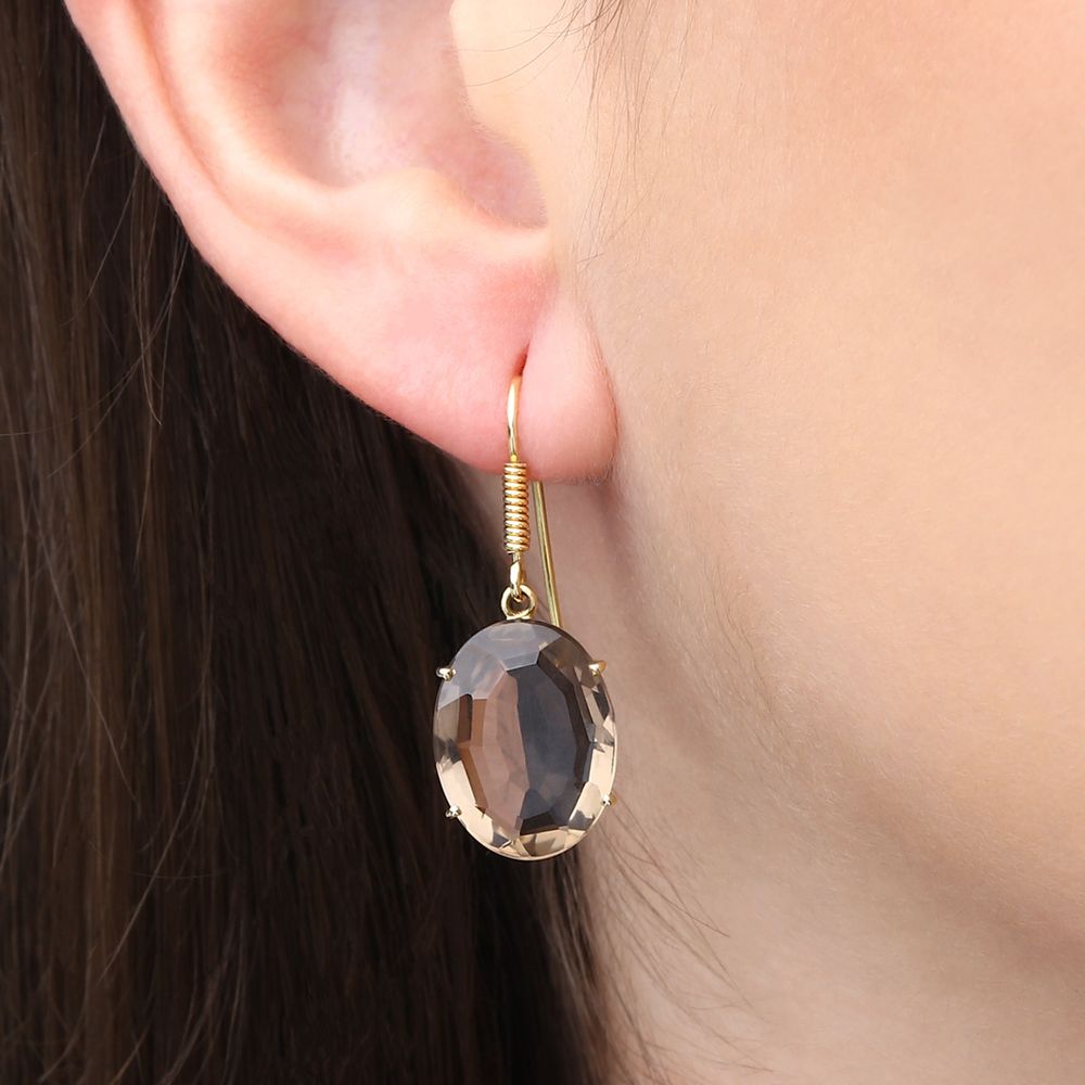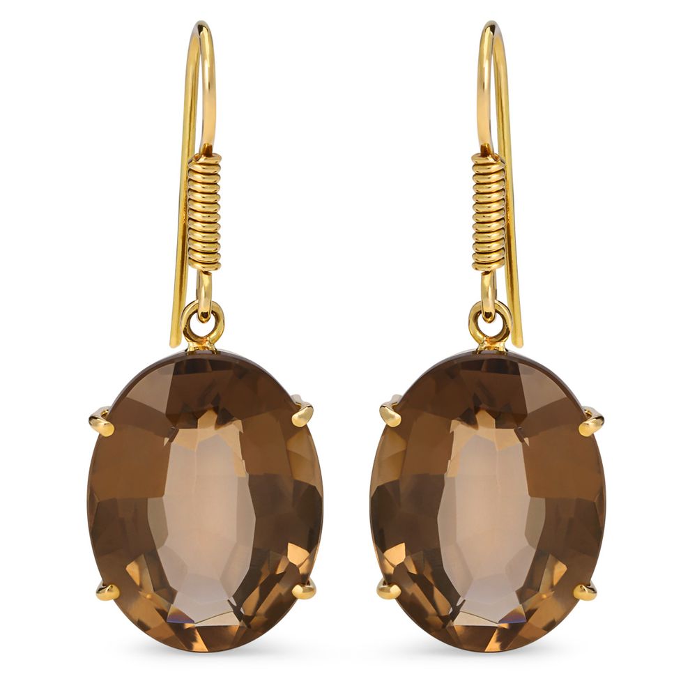 Este impressionante par de brincos apresenta topázios fumê de 15cts, lapidados em formato oval para realçar o brilho profundo e a riqueza de sua cor, que transita entre os tons terrosos e acinzentados.