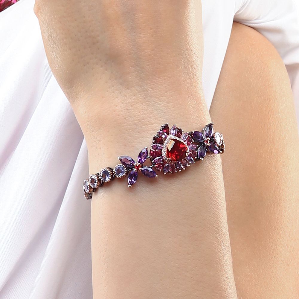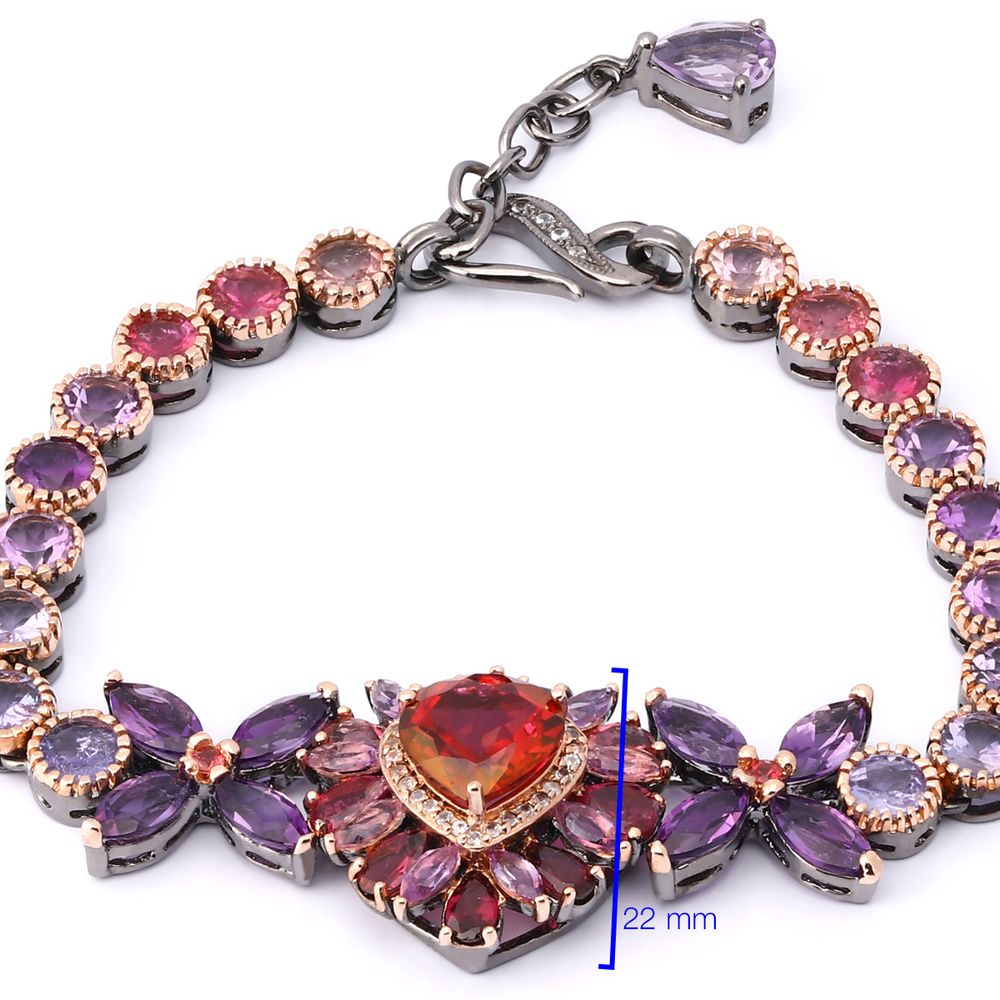 Pulseira Coração Com Topázios Vermelhos e Mix de Pedras Prata