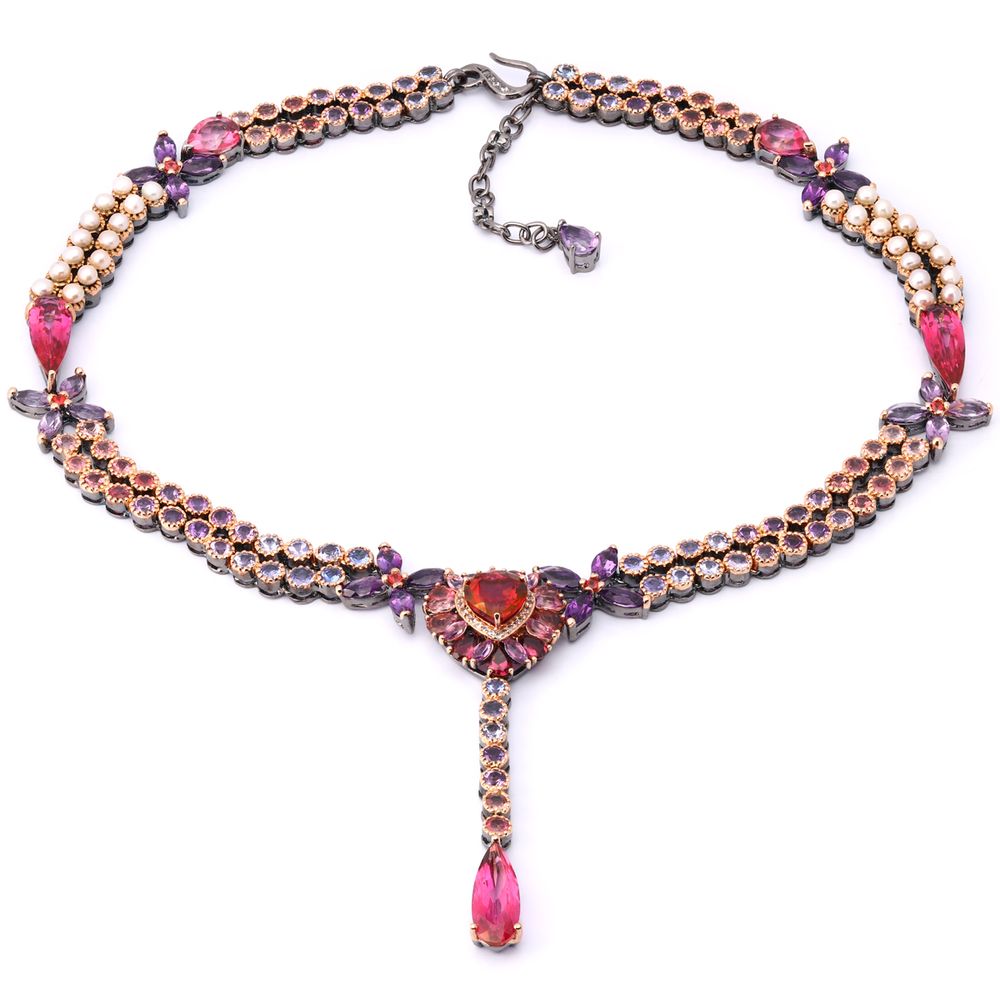 Em pedras:Topázio Vermelho,Safiras Coloridas,Turmalins Rosas,Ametistas,Zicônias,Pérolas Baby ( tot. aprox. 63cts) Prata