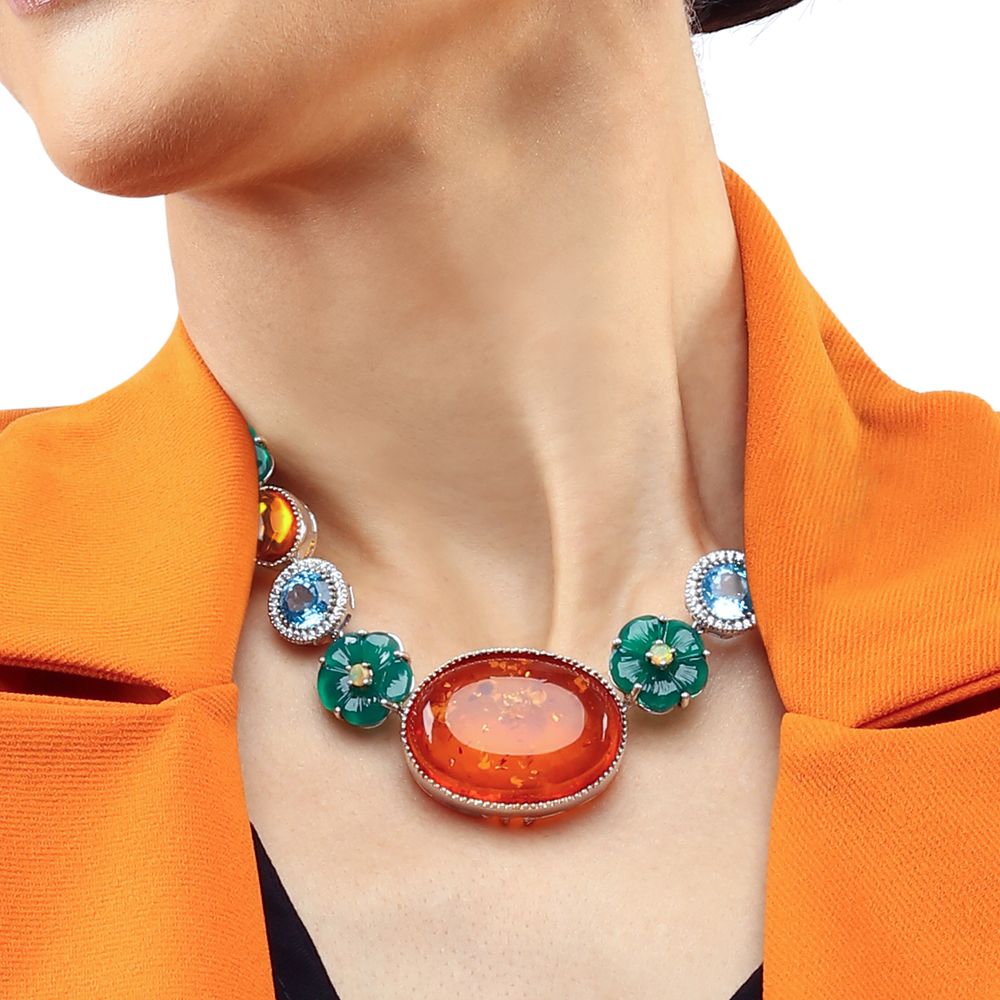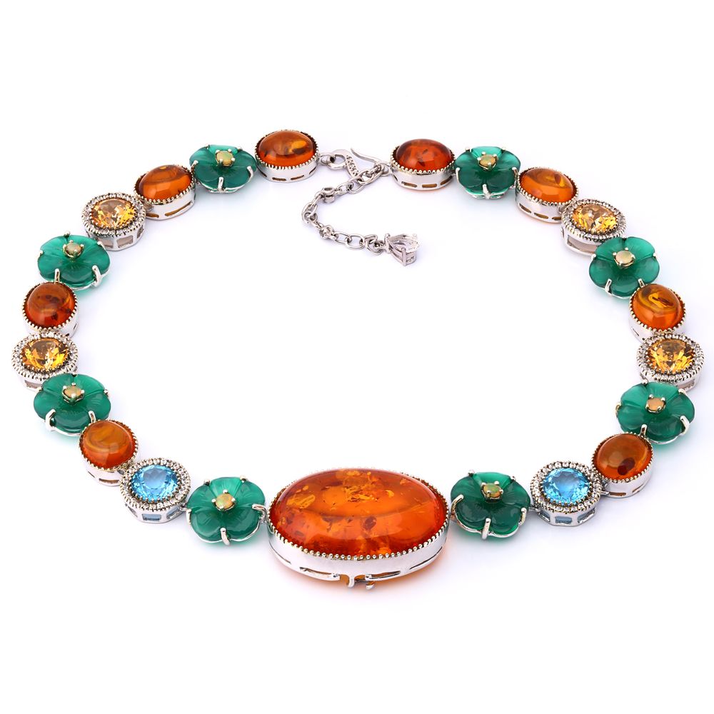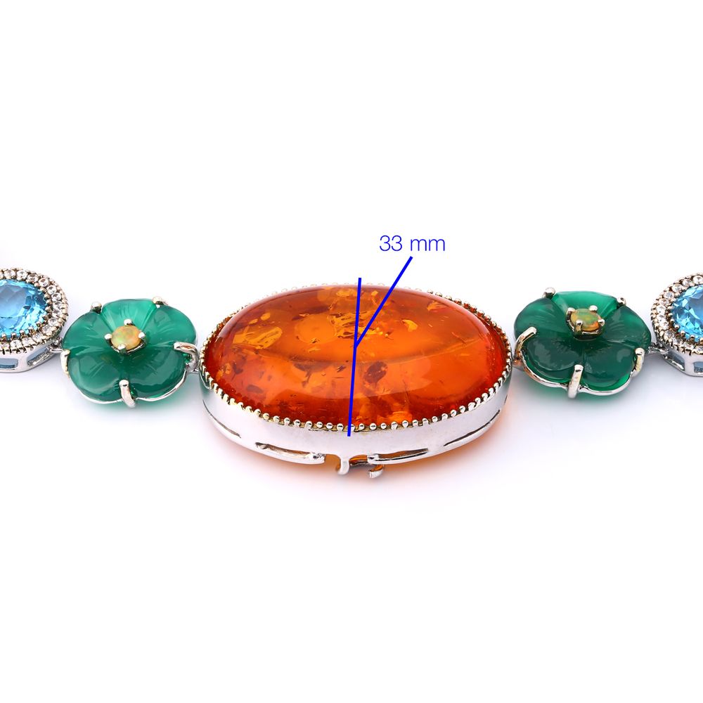 Em pedras:Âmbar,topazios azuis,Opalas,Calcedônia,Zircônias,Topázio Brancos,Quartzo Amarelo ( tot.aprox. 101 Cts)
