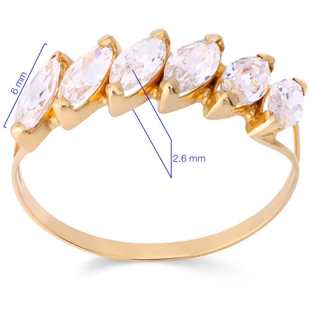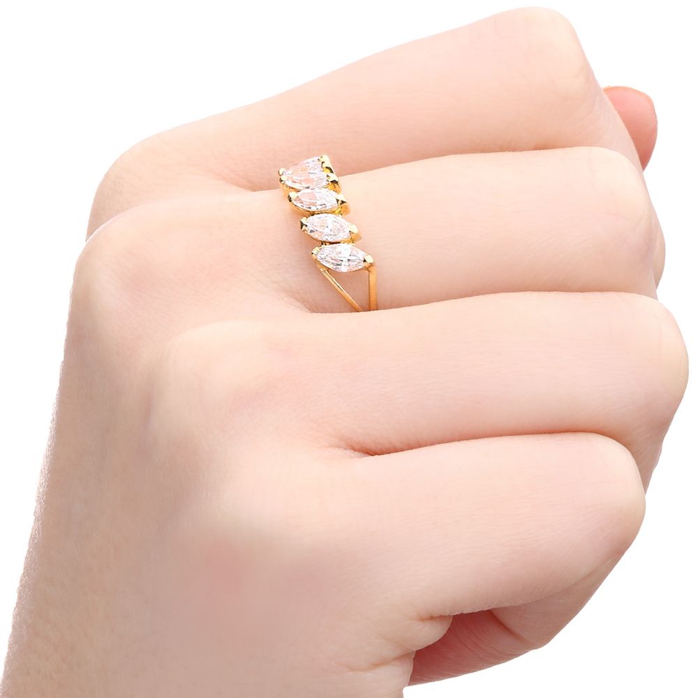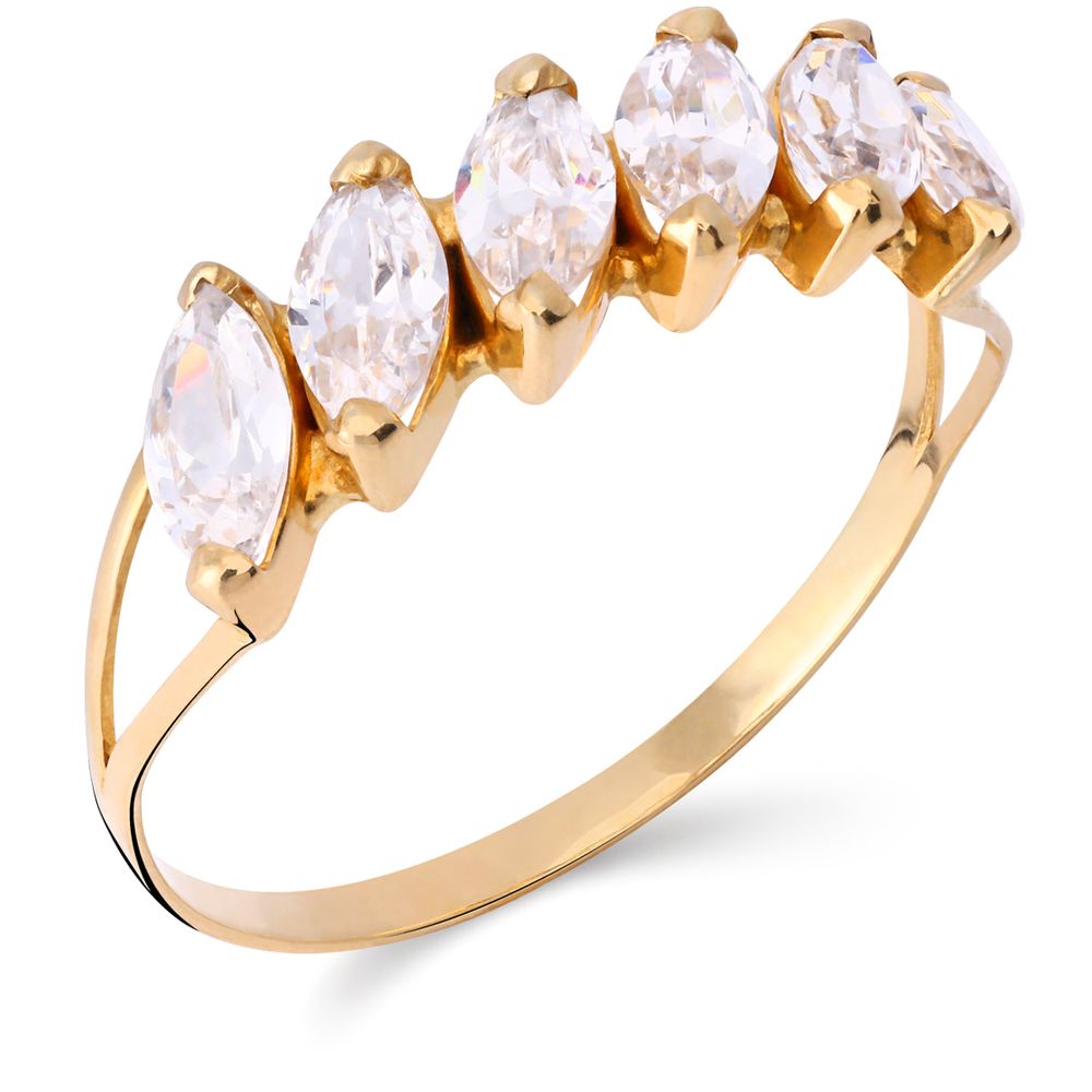 Com design marcante e sofisticado, esta meia aliança com 6 zircônias em lapidação navete encanta pelo brilho e pela elegância de suas formas alongadas.